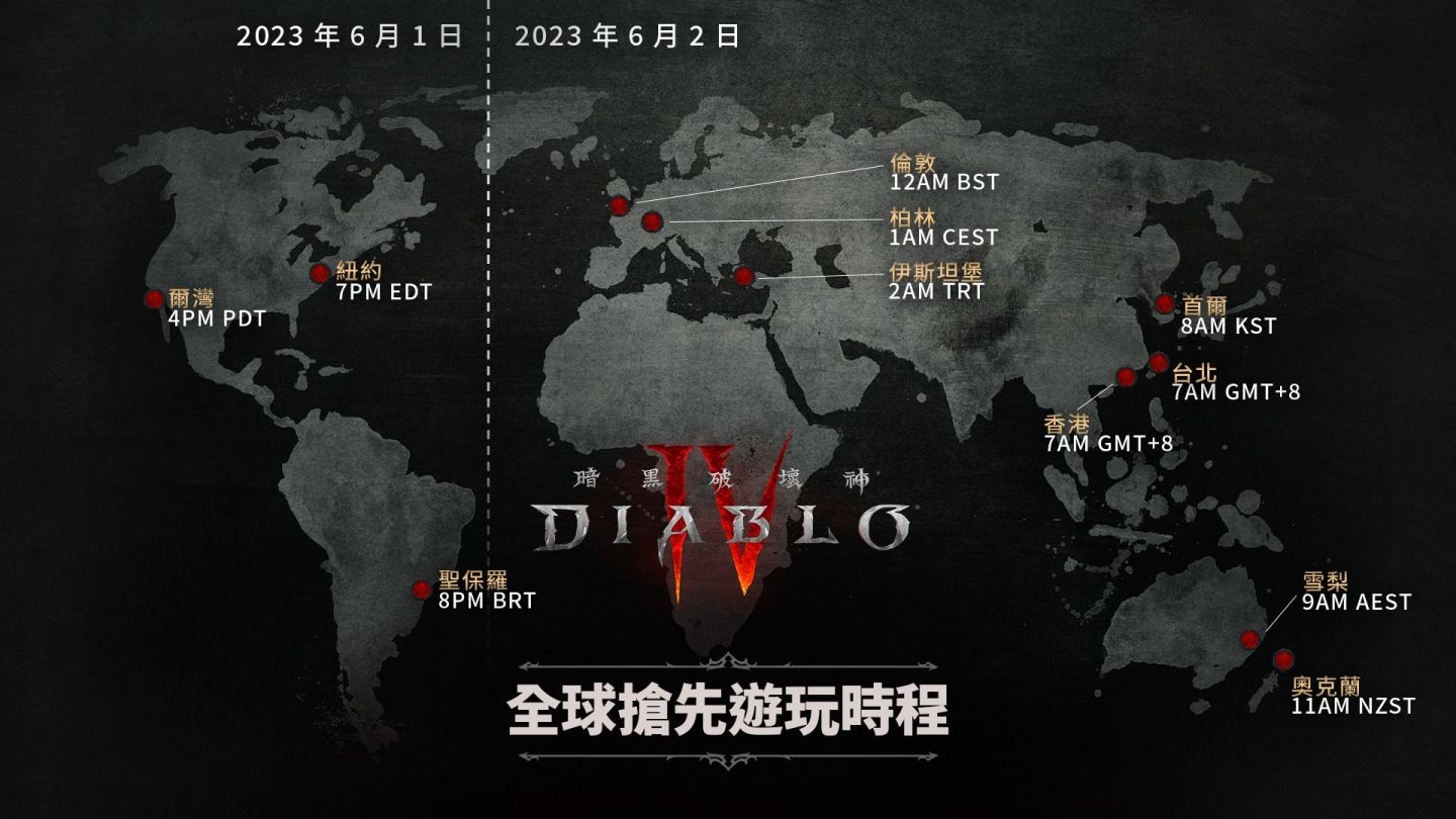 《暗黑破壞神4》正式推出時間為台灣時間 6 月 6 日上午 7 點。如在正式發行前購買數位豪華版或終極版,便可參加台灣時間 6 月 2 日上午 7 點的《暗黑破壞神4》搶先體驗,第一賽季預計將在 7 月中展開。