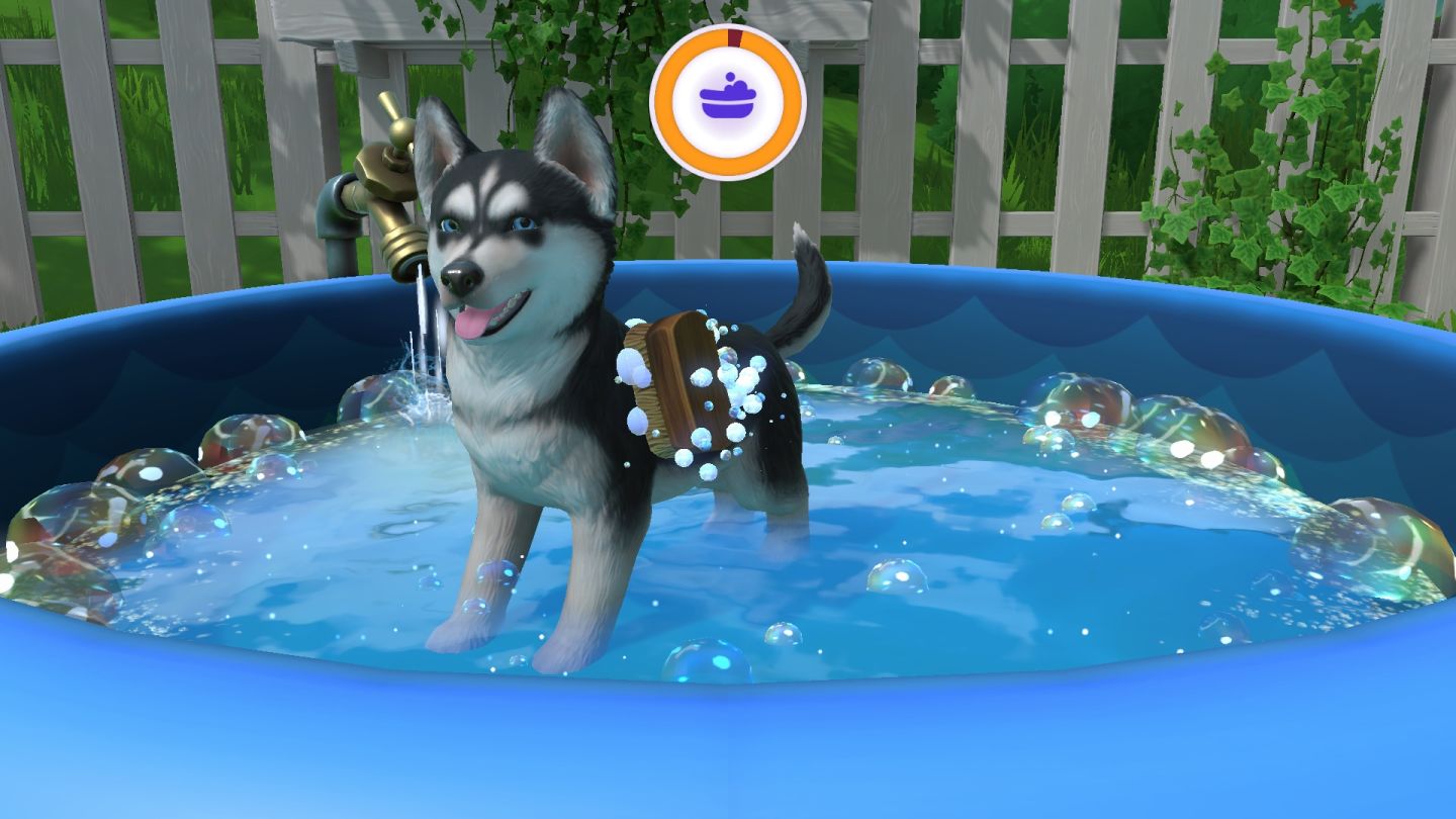 經常四處奔跑難免會弄得身上都是泥巴,甚至髒兮兮得連原本的毛色也看不見了!家裡的庭院有一個充滿泡泡的水池,讓小狗一邊泡澡,一邊上移動刷子擦洗牠的毛髮,讓牠們成為人見人愛的乾淨小狗吧。
