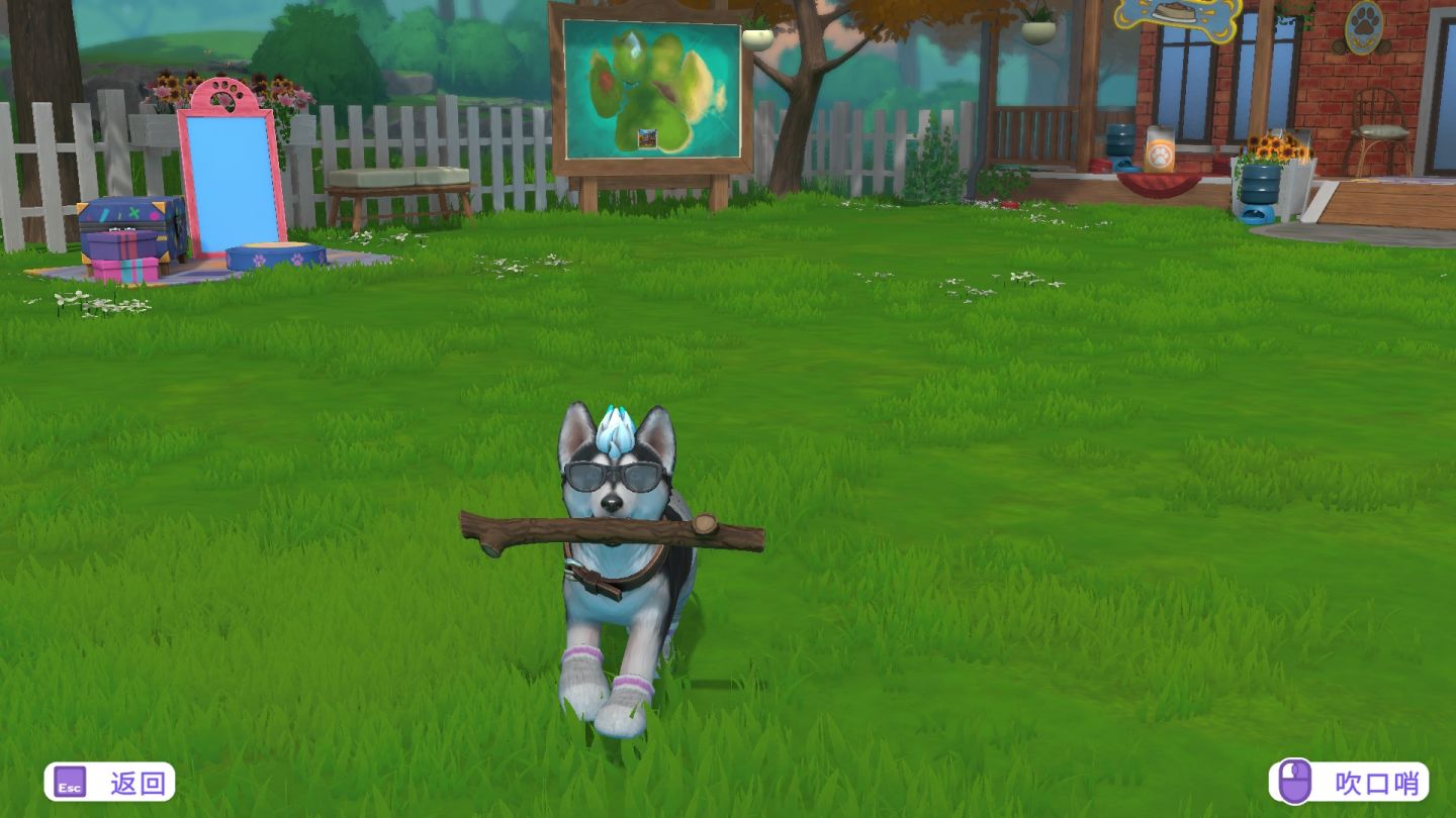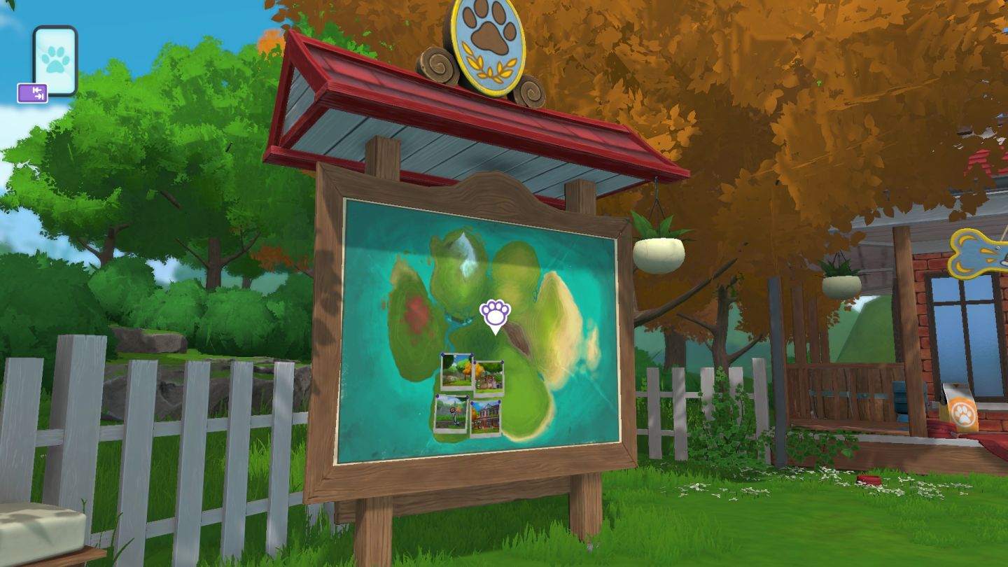 庭院內有一塊回憶板,張貼著可愛的狗爪形小島地圖。回憶板會顯示出重要時刻、各個發現以及在這座島嶼四處冒險時達成的成就,滿載著您與小狗們的溫馨時刻。