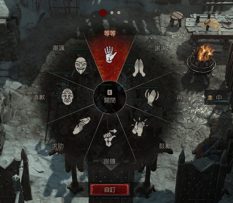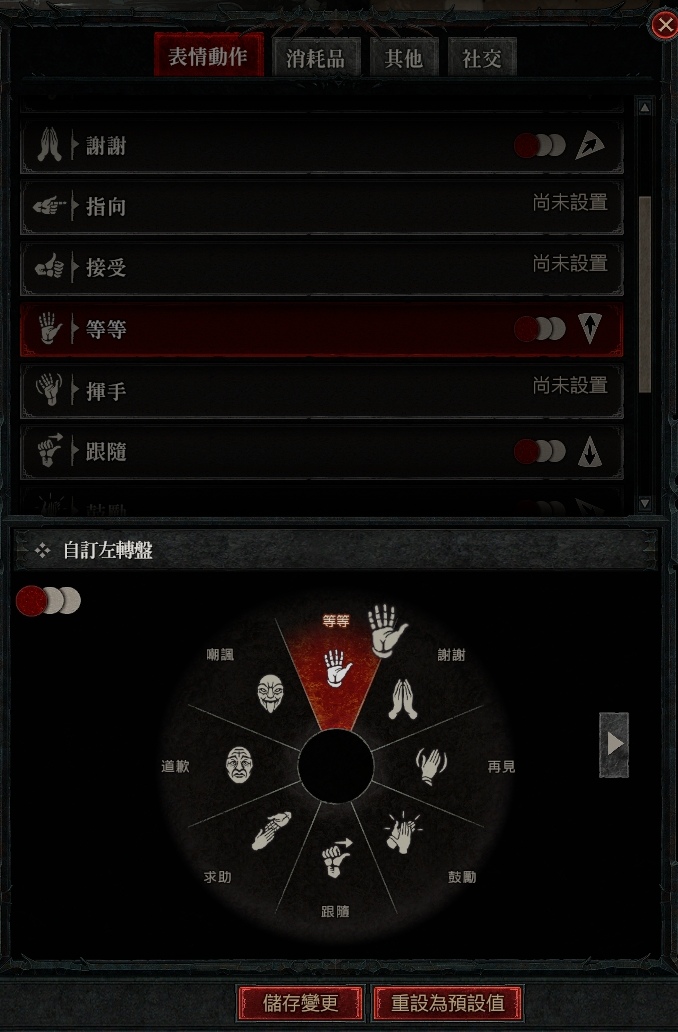 先選擇轉磐上任何一個區塊,並在上面表情動作區中找到「等等」,將「等等」指定到轉盤中即可使用。