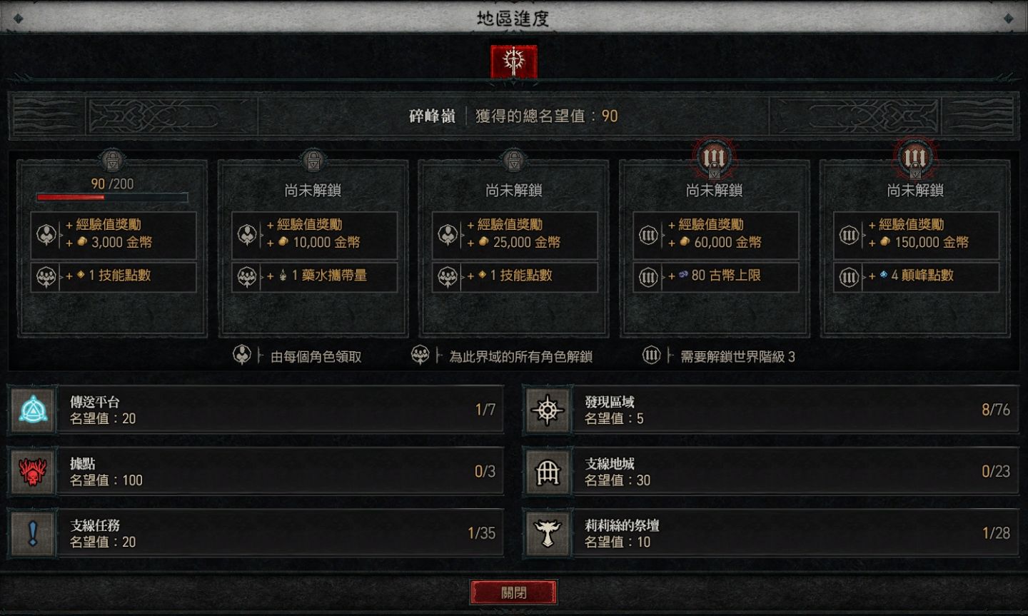 《暗黑破壞神》系列新作《暗黑破壞神4》即將在 6/6 正式推出,本作具備一個很重要,卻也很容易被忽略的新系統「地區名望值」,提升名望值可以讓自己帳號中的角色獲得包括技能點數、藥水攜帶上限增加、古幣上限增加等等重要效果。