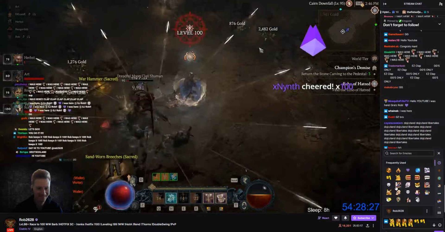 《暗黑破壞神4》豪華版與終極版玩家已可在 6/2 登入遊玩,玩家之間的衝等競賽也隨之展開,網站 DiabloBuild 同時舉辦衝等實況活動,讓所有人都能看到這些前端玩家衝等進度。而 Rob2628 的野蠻人一路保持領先,最終用了約 54 小時達成封頂。其 build 為三招戰吼配狂戰之怒大絕,以猛撲搭配旋風斬為主攻招式。