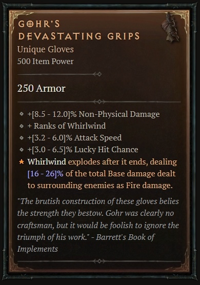 在裝備部份,他一度使用「戈爾的摧殘護手套」,其能力特殊效果為「旋風斬結束時會爆炸,爆炸傷害為之前對附近敵人造成基礎傷害總和 50 – 70% 的火焰傷害」,由於玩家可以自由控制旋風斬開始與結束,只要簡單點放旋風斬,即可多次觸發該特效造成極大量範圍傷害,這讓他在大量農怪時擁有極大優勢。
