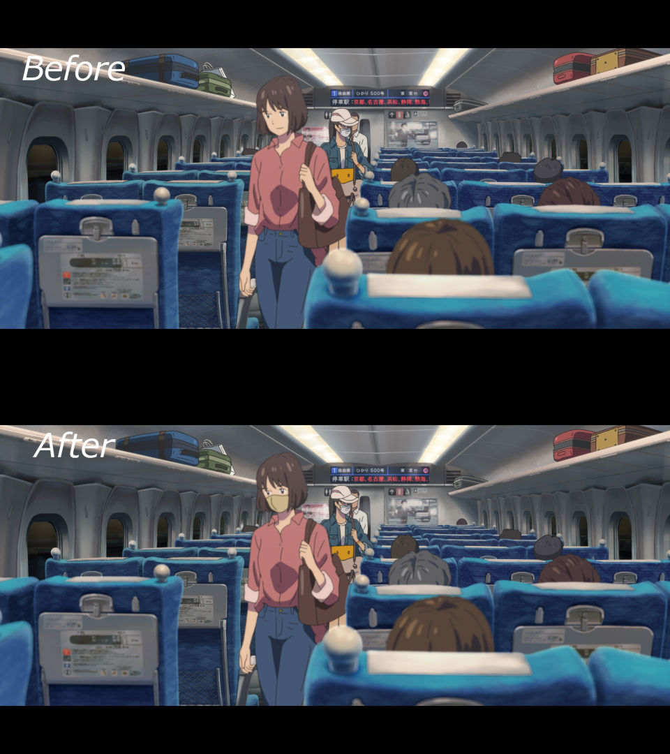 日前官方推特釋出幾張重製的照片與影像,讓許多觀眾期待不已。除了精修許多細節以外,還多了其他交通工具乘客戴上口罩的畫面。新海誠說明:「在新冠疫情期間進行製作的這部作品,我們不描繪口罩的原因是考慮到作品可能在疫情結束後公開,以及避免偏離這部作品真正的焦點『地震』。而鈴芽戴上口罩,本來的用意是她離家出走需要喬裝。然而公開已經過了數月,新冠疫情也漸漸成為過去的歷史,我們開始認為應該在電影中保留痕跡。《鈴芽之旅》是發生在 12 年前的震災世界的故事,應該與現實緊密相連。因此對一些場景進行了修正,為角色添加了口罩。」