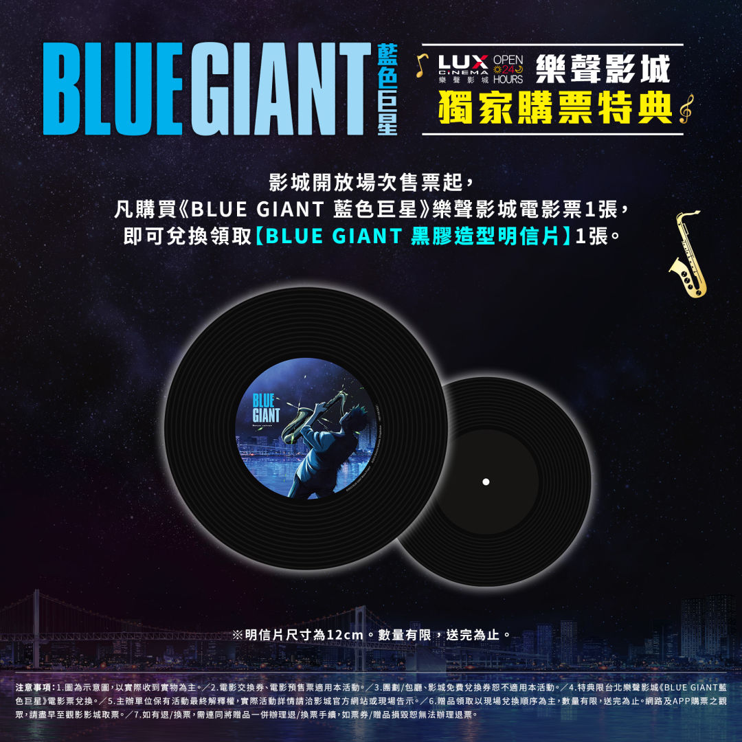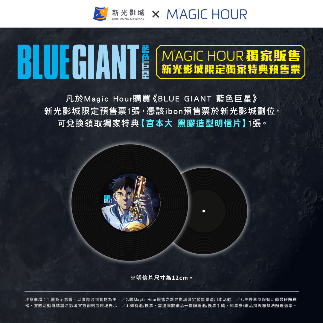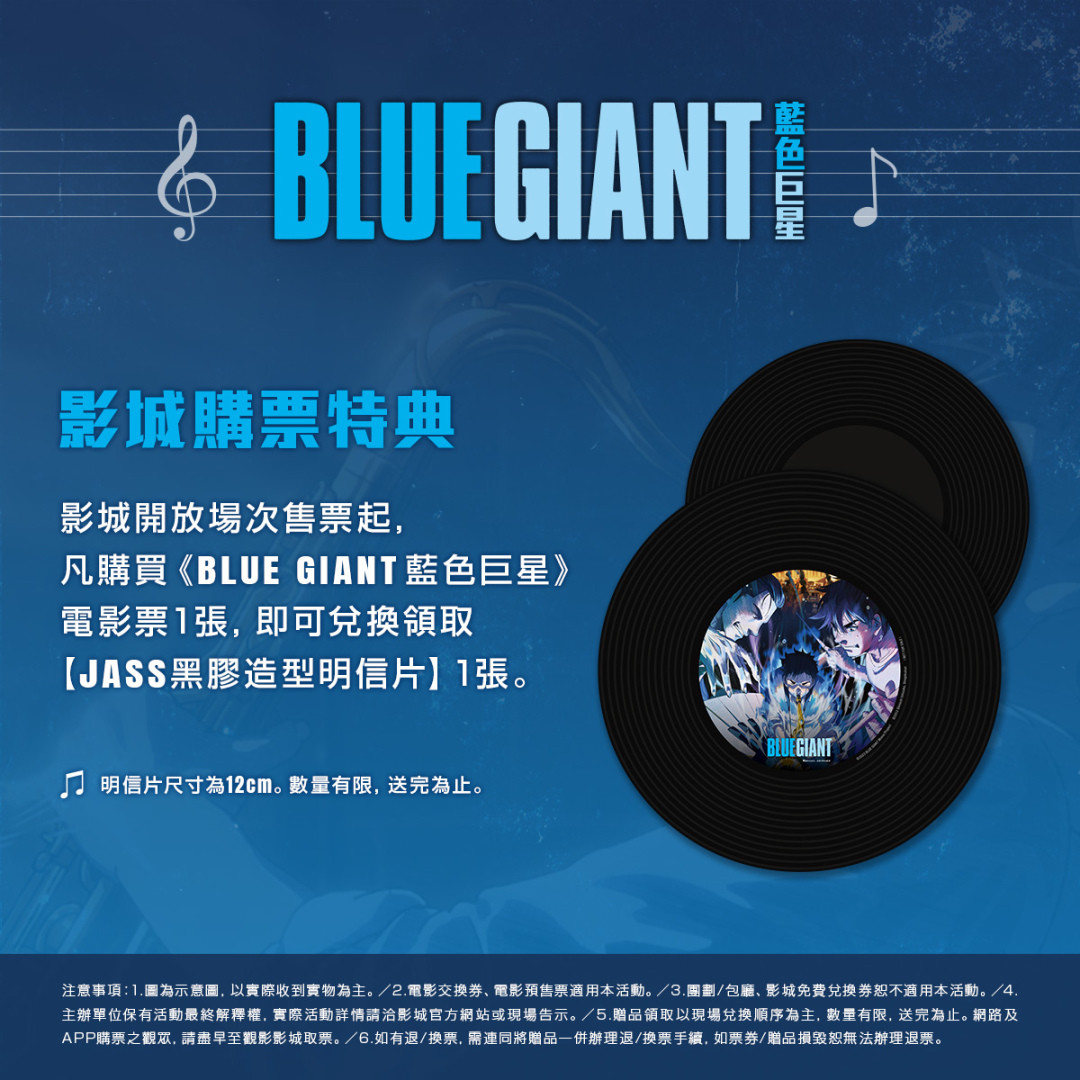 電影《BLUE GIANT 藍色巨星》將在本週五 6/9 正式在台上映,車庫娛樂也為期待已久的粉絲準備精美購票特典,凡於全台上映影城購買《BLUE GIANT 藍色巨星》電影票乙張,即可獲得「JASS 黑膠造型明信片」乙張;凡於樂聲影城購買《BLUE GIANT 藍色巨星》電影票乙張,即可獲得樂聲影城獨家特典「BLUE GIANT 黑膠造型明信片」乙張;凡於 Magic Hour APP 購買新光影城限定《BLUE GIANT 藍色巨星》預售票乙張,即可憑票於新光影城劃位票口兌換新光影城獨家特典「宮本大 黑膠造型明信片」乙張,數量有限,想要收藏的粉絲敬請把握機會!