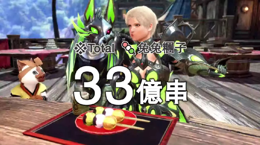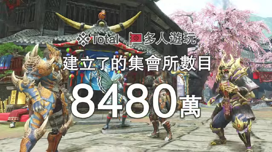 獵人們吃掉的兔兔團子總數量多達 33 億串,獵人們取得翔蟲總數為 51 億次,乘騎加爾克次數更高達 121 億次,BGM「Scarlet Feast」播放時間為 18 萬日,力竭倒下次數為 14 億次,交換技語音次數多達 251 億次,完成任務 BGM 播放次數為 32 億次,多人遊玩創建集會所數目為 8,480 萬等等。