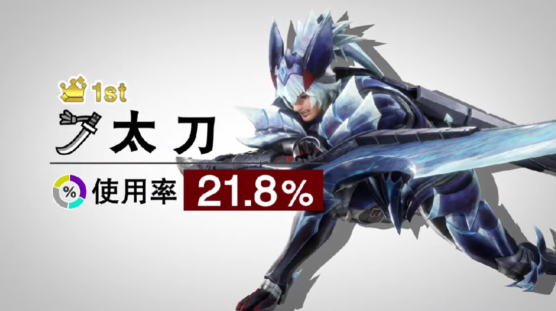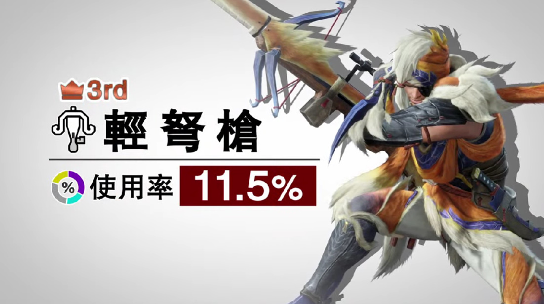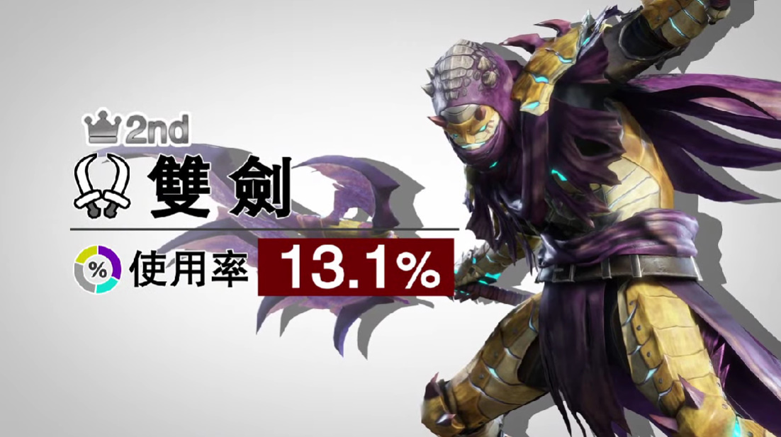除了狩獵數量排行榜以外,官方也對獵人們的武器愛好做了分析統計表,獵人最常用的武器前三名分別由太刀(21.8%)、雙劍(13.1%)、輕弩(11.5%)拿下,其他武器使用率依序為弓(7.1%)/大劍(6.8%)/斬擊斧(6.1%)/充能斧(5.7%)/重弩(5.7%)/單手劍(4.6%)/操蟲棍(4.2%)/大錘(3.7%)/狩獵笛(3.6%)/銃槍(3.2%)/長槍(3.0%),不同類別武器的人氣武器和人氣鐵蟲絲招式也一併揭曉。
