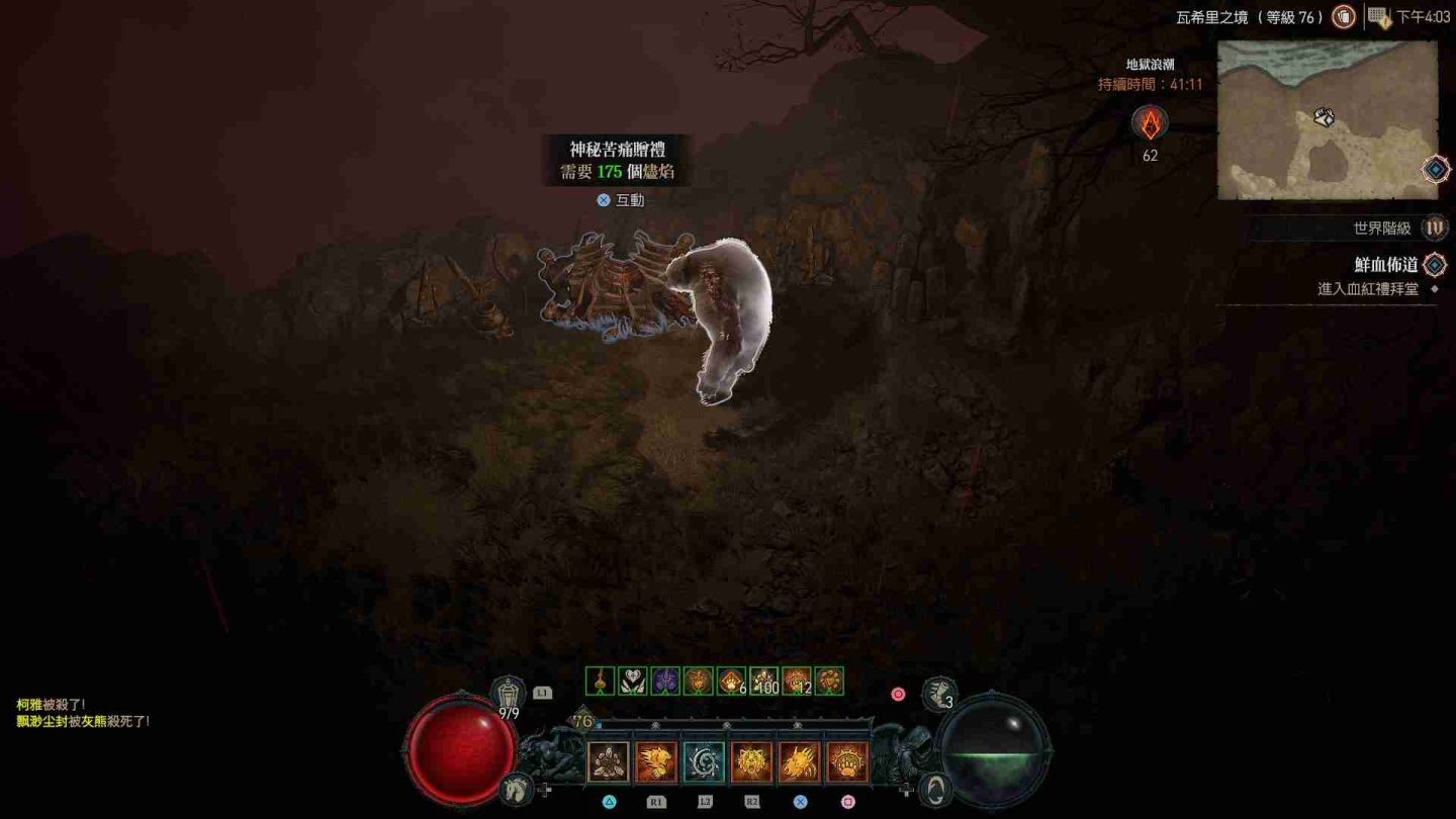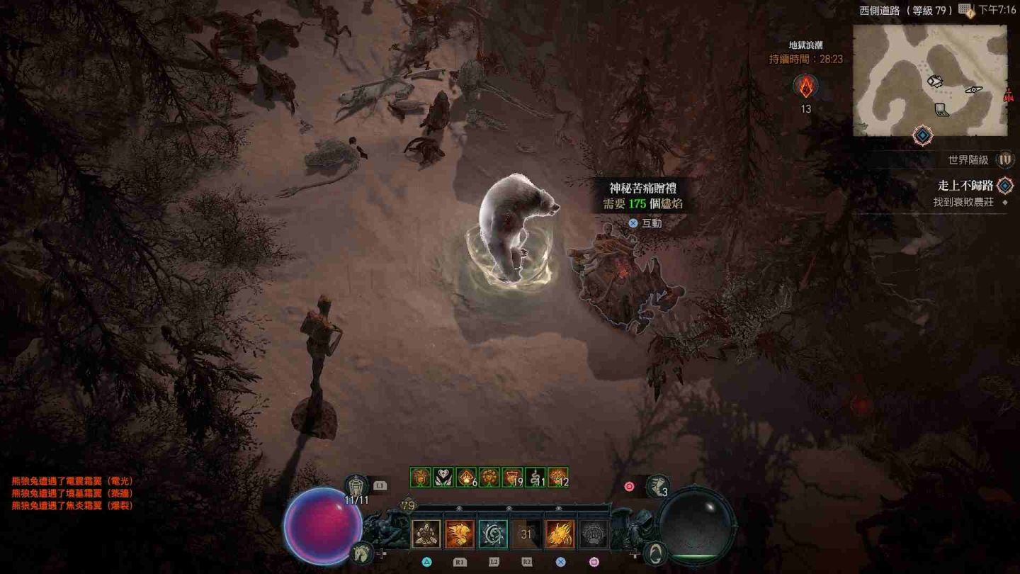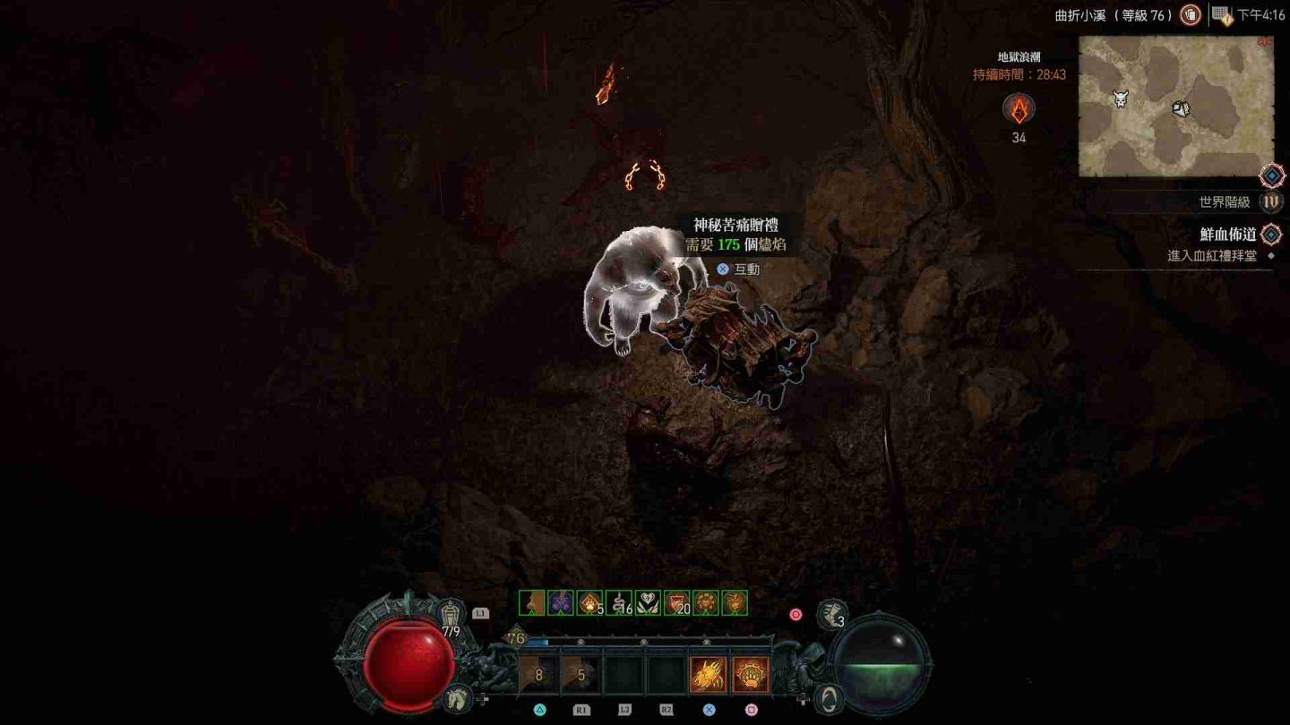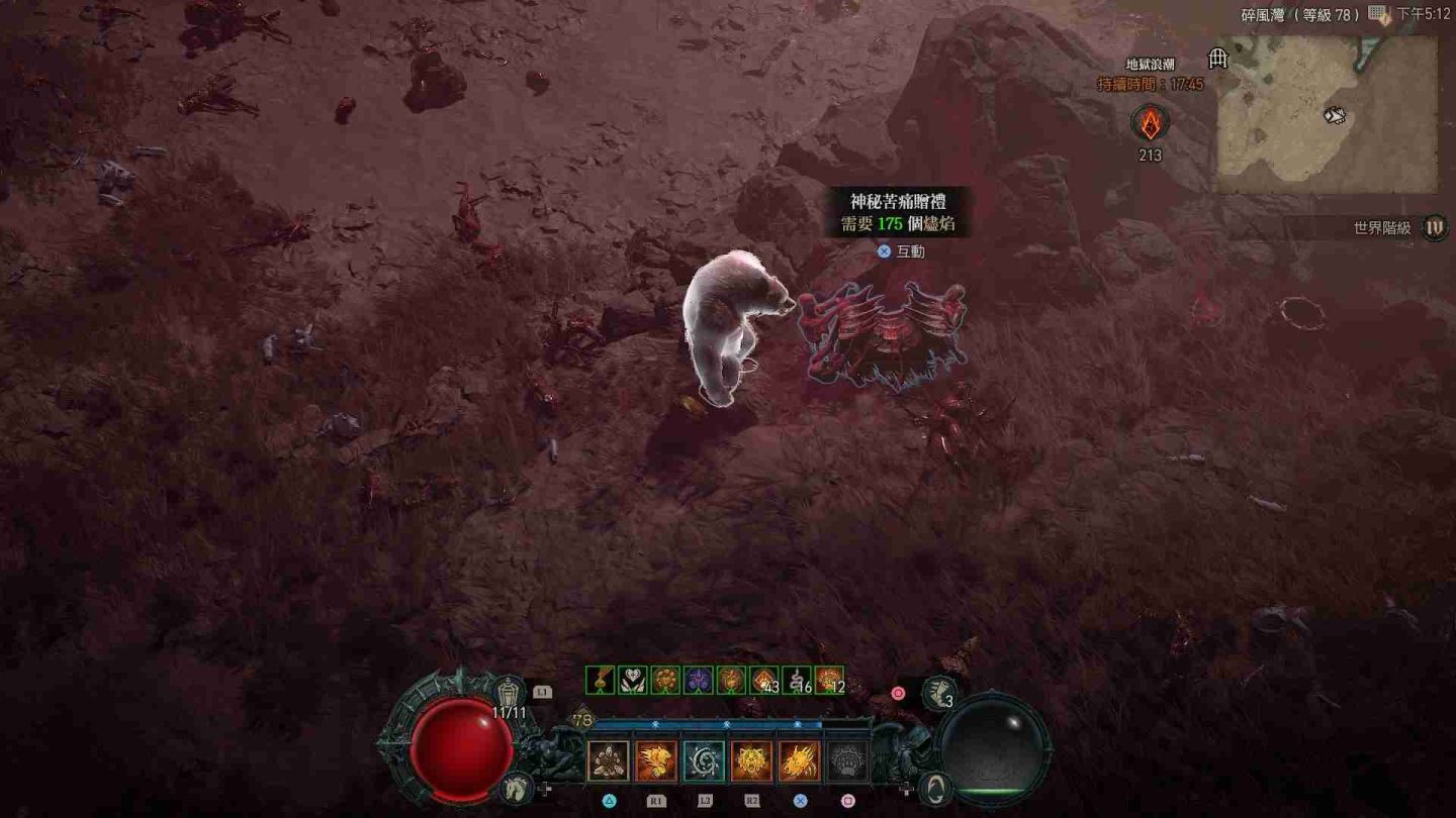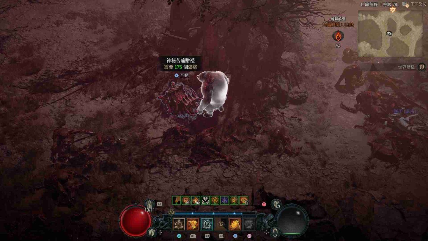 受地獄浪潮影響的區域會在地圖上顯示為血紅色,除了大量惡魔軍團增生外,也會出現各類名為「苦痛贈禮」的寶箱