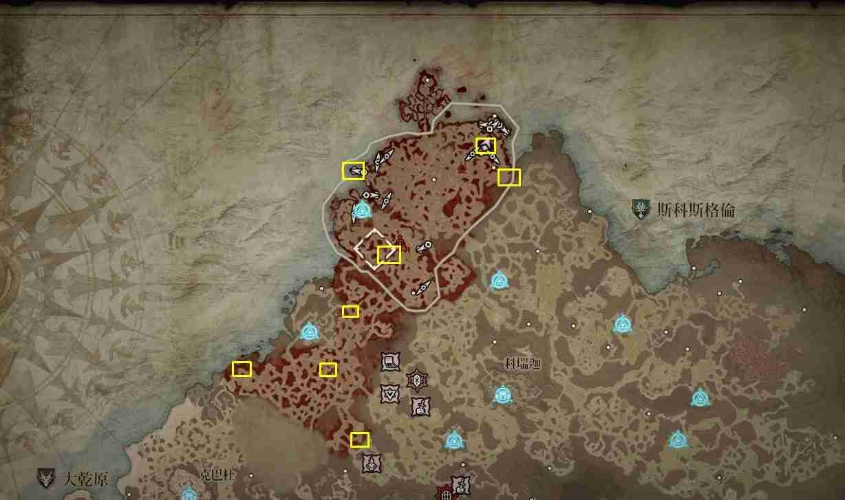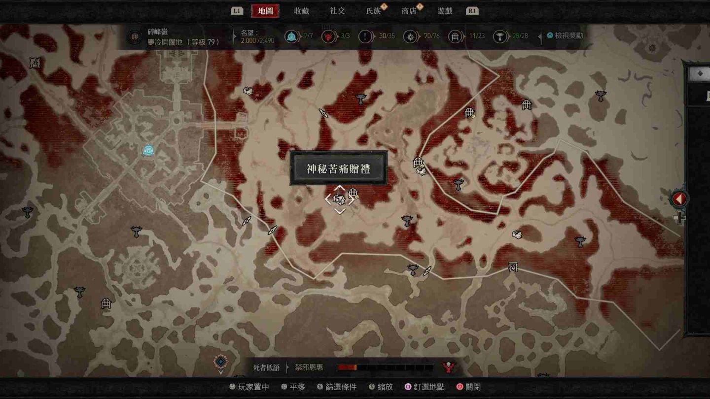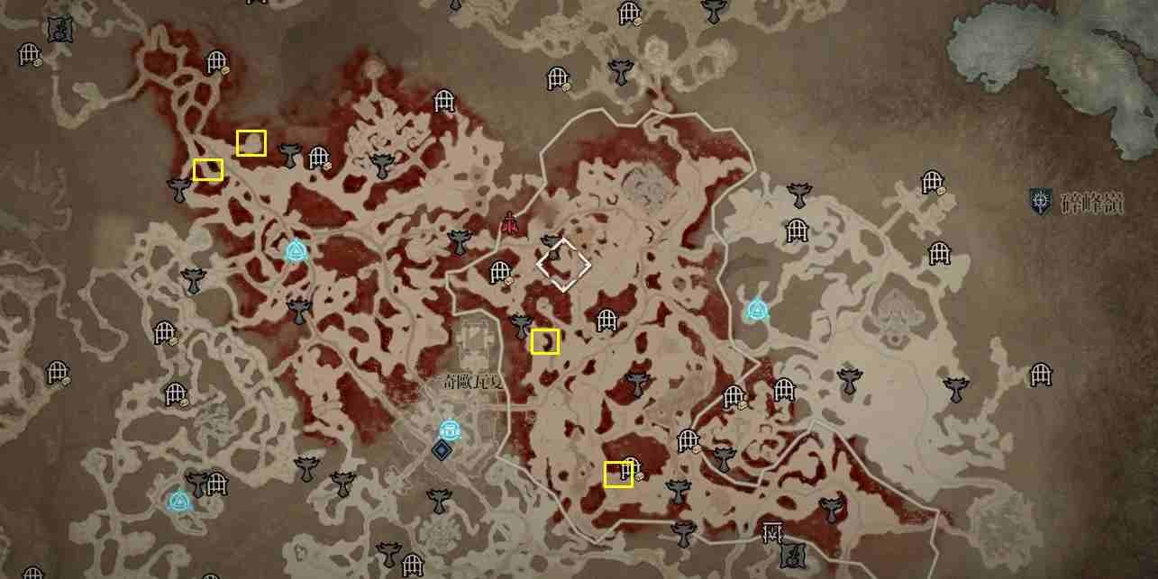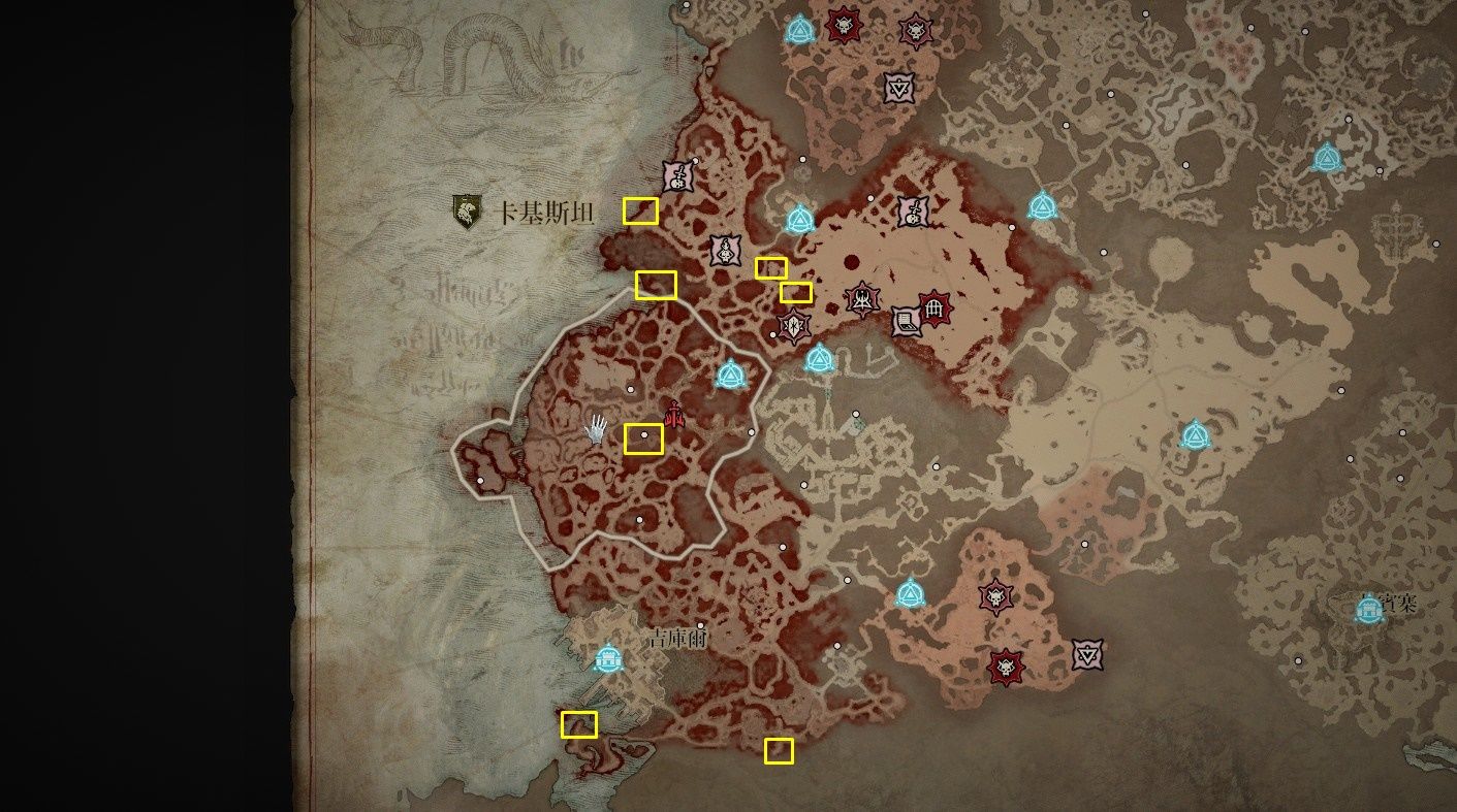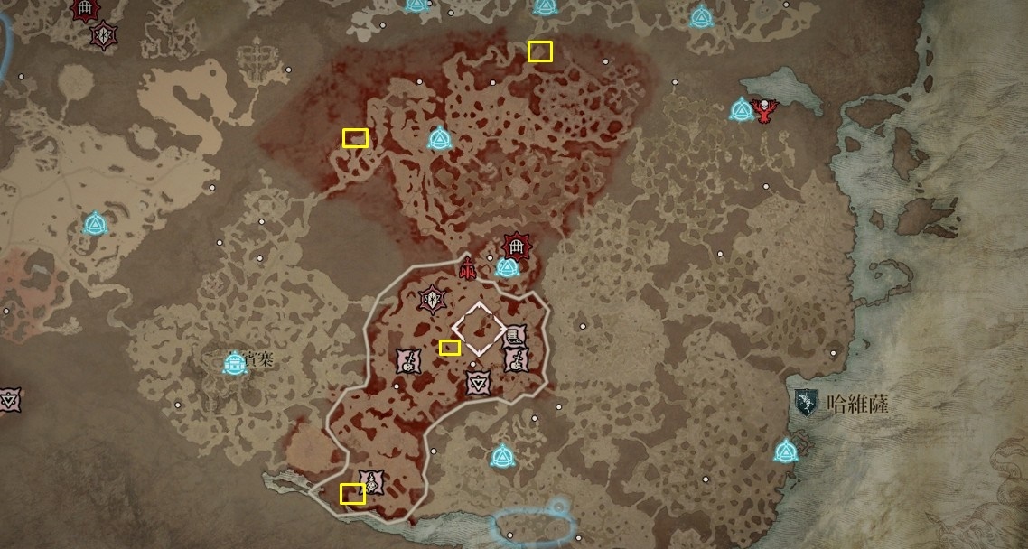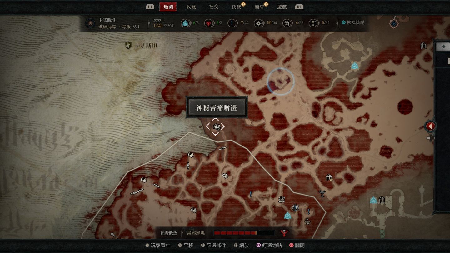 - 南部開闊地秘苦痛贈禮:傳送點南方的「船骸灣」山頂處以及傳送點東南方的「哈坎綠洲」邊緣小道區。
