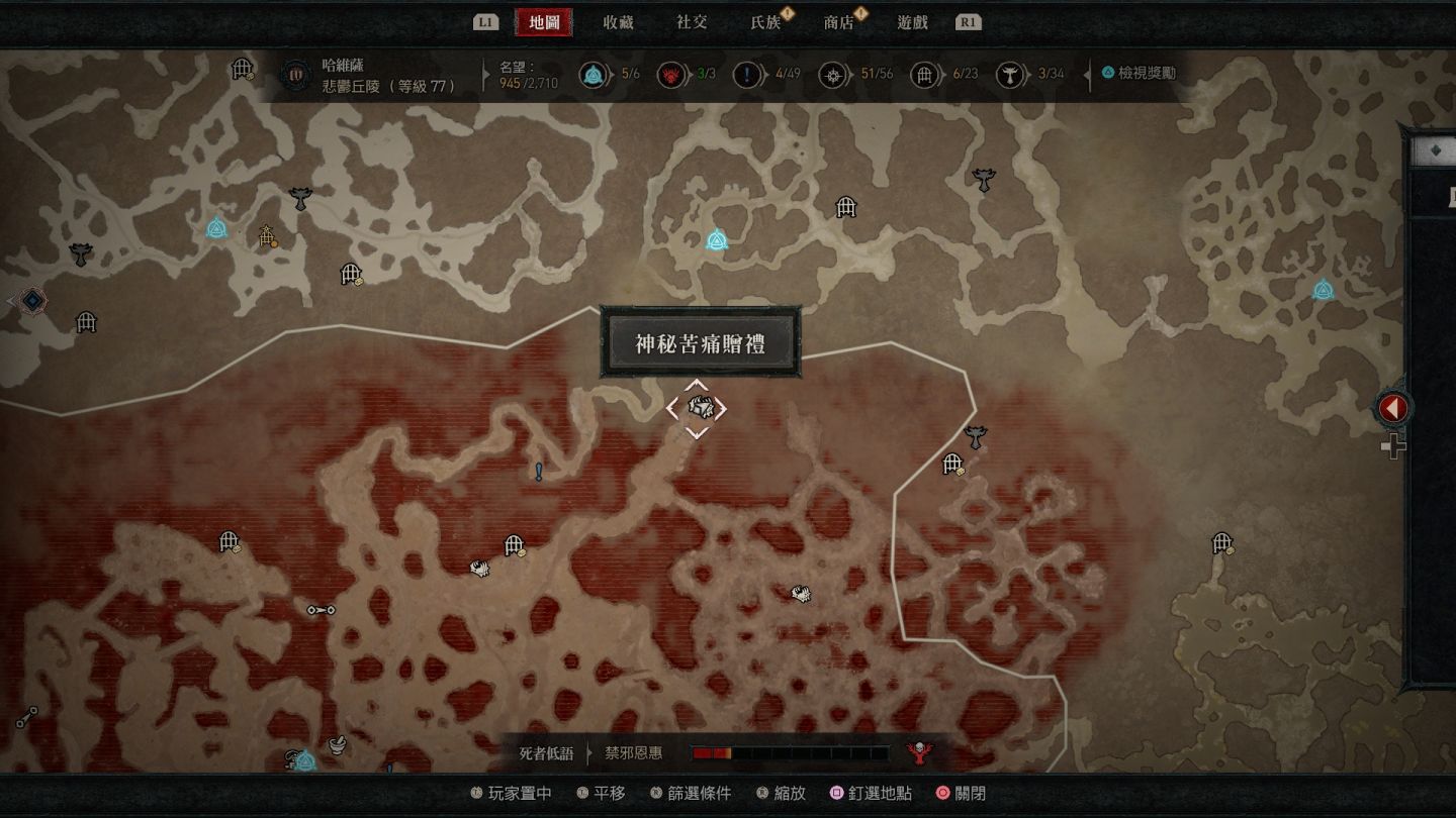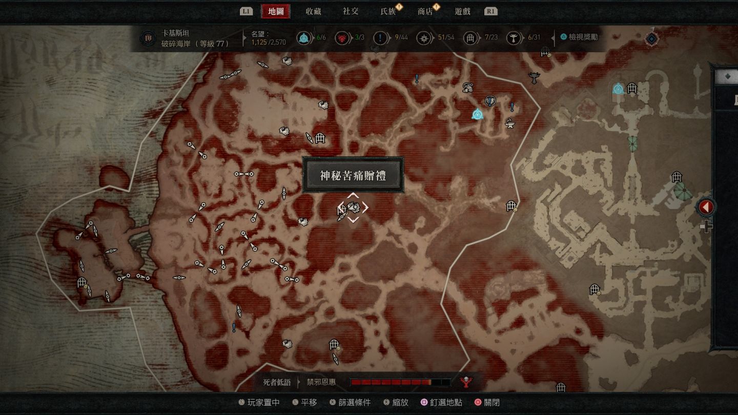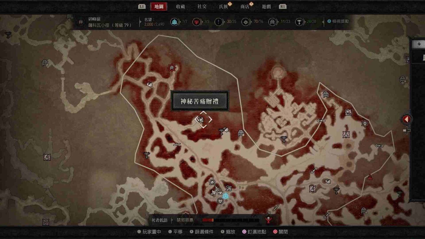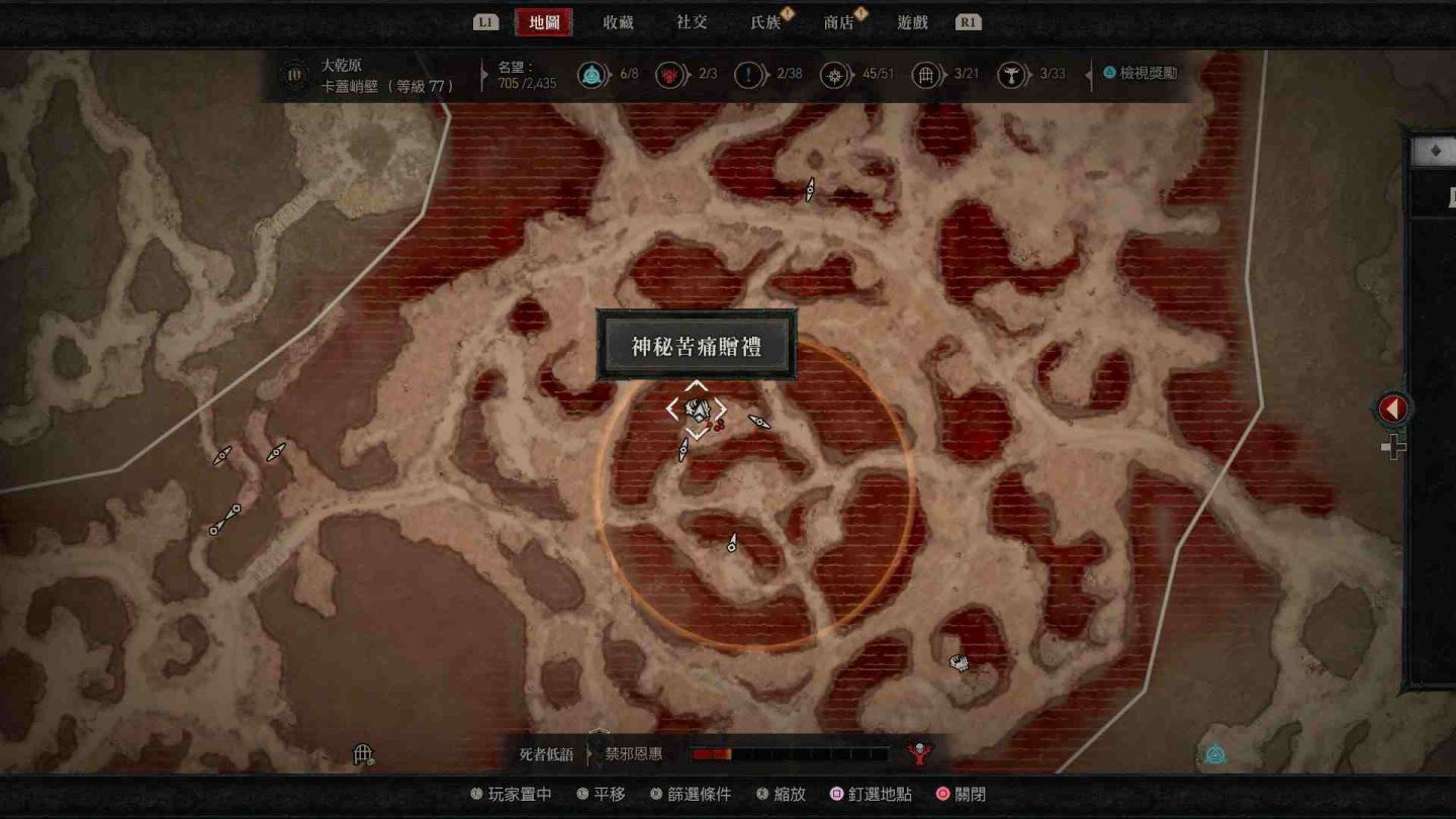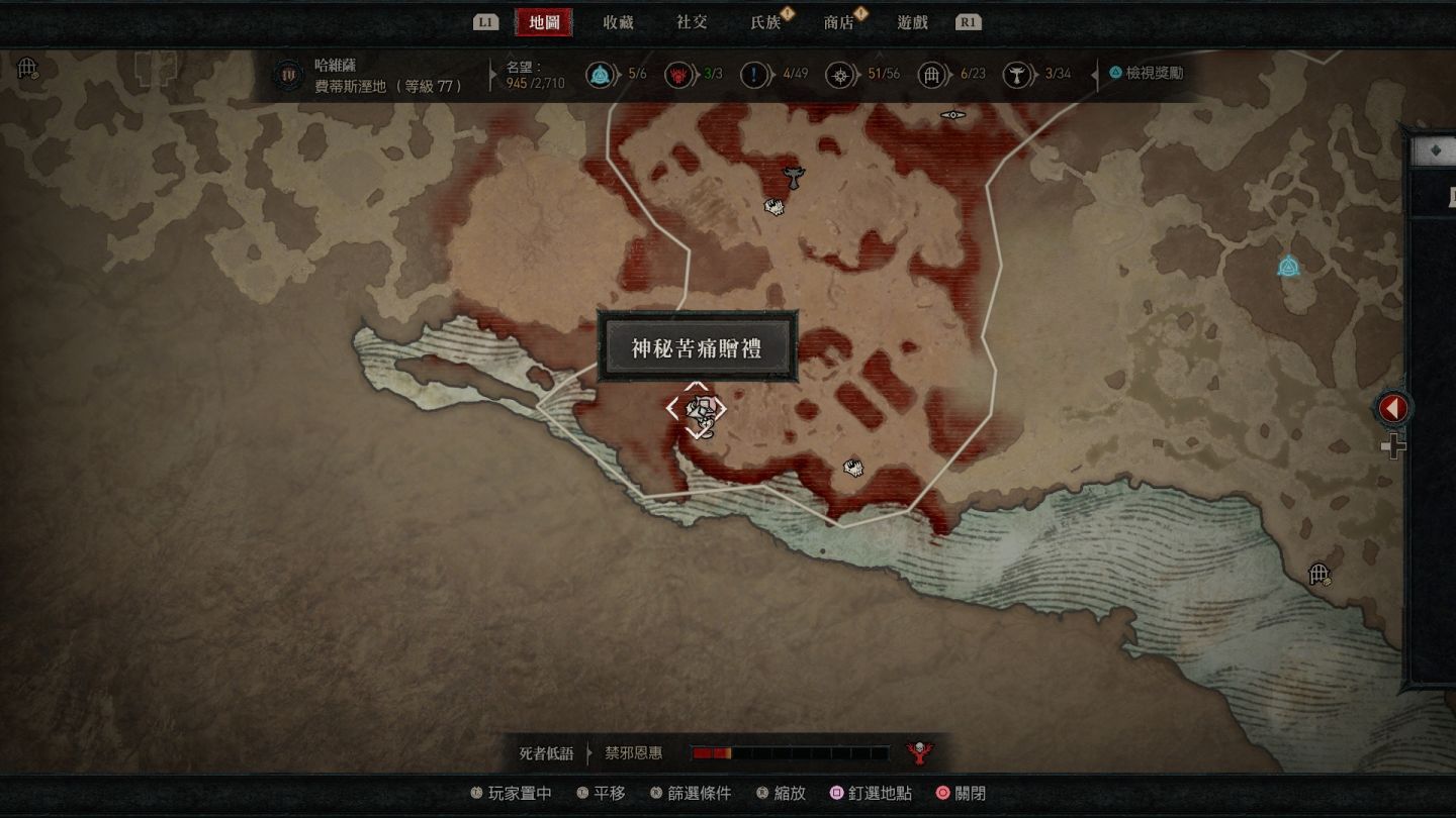 - 南部開闊地秘苦痛贈禮:傳送點南方的「船骸灣」山頂處以及傳送點東南方的「哈坎綠洲」邊緣小道區。
