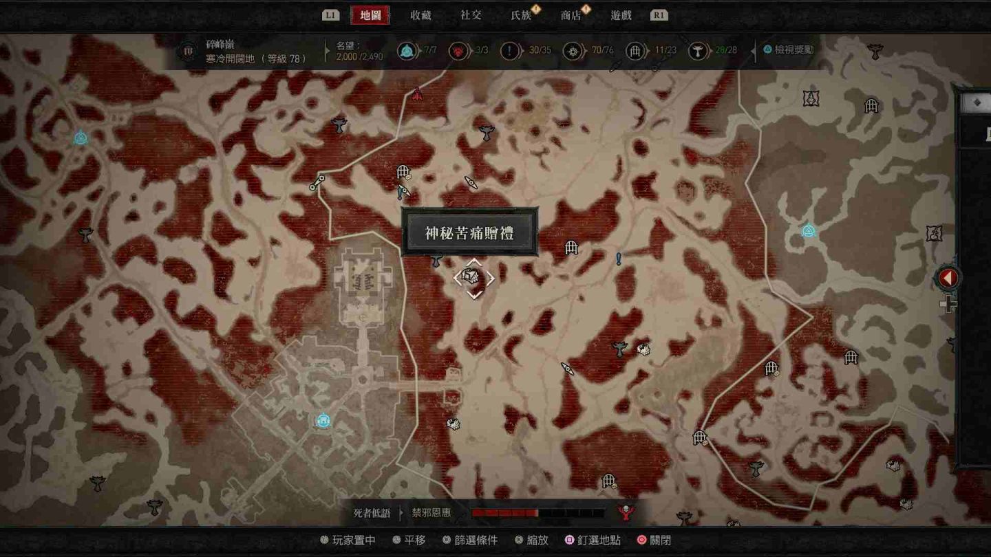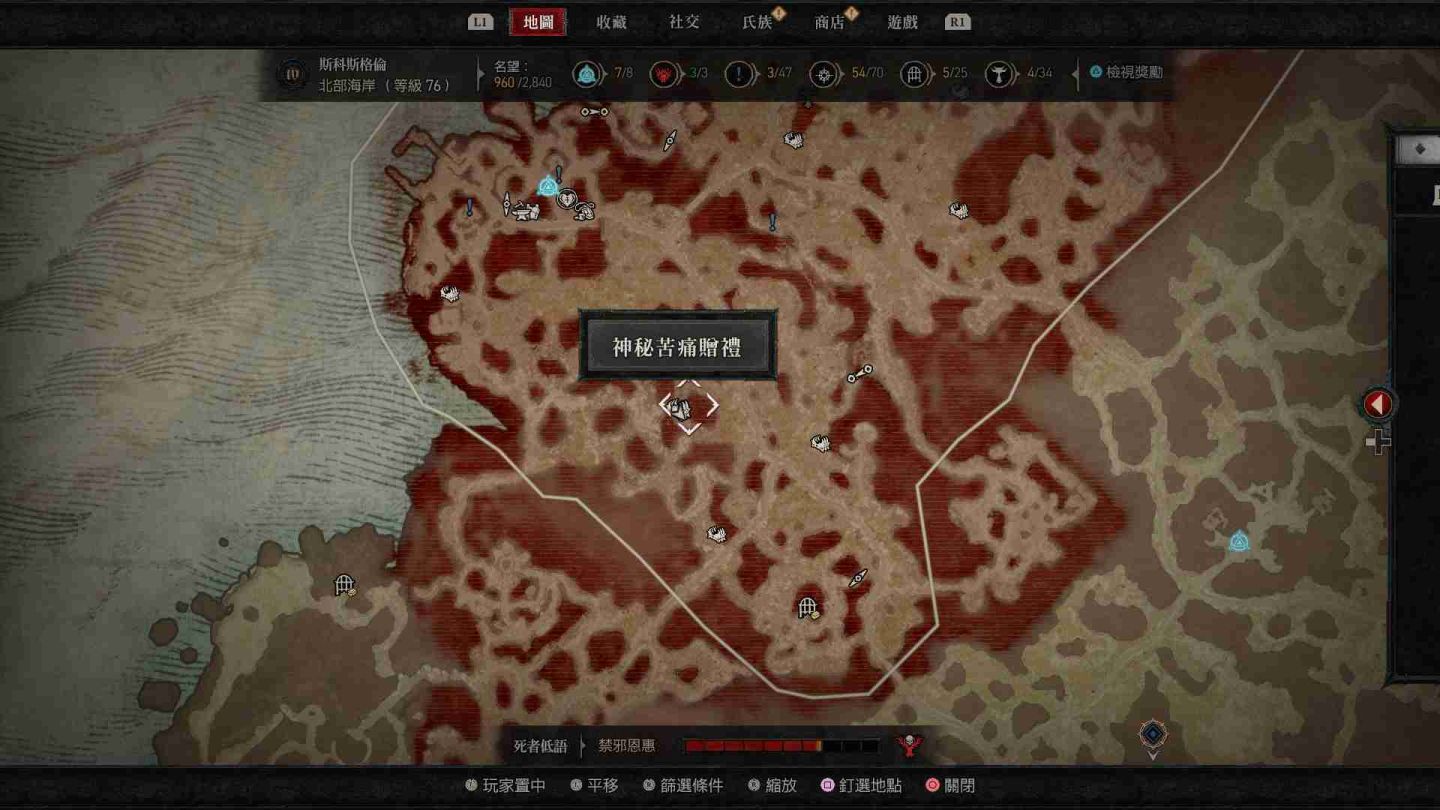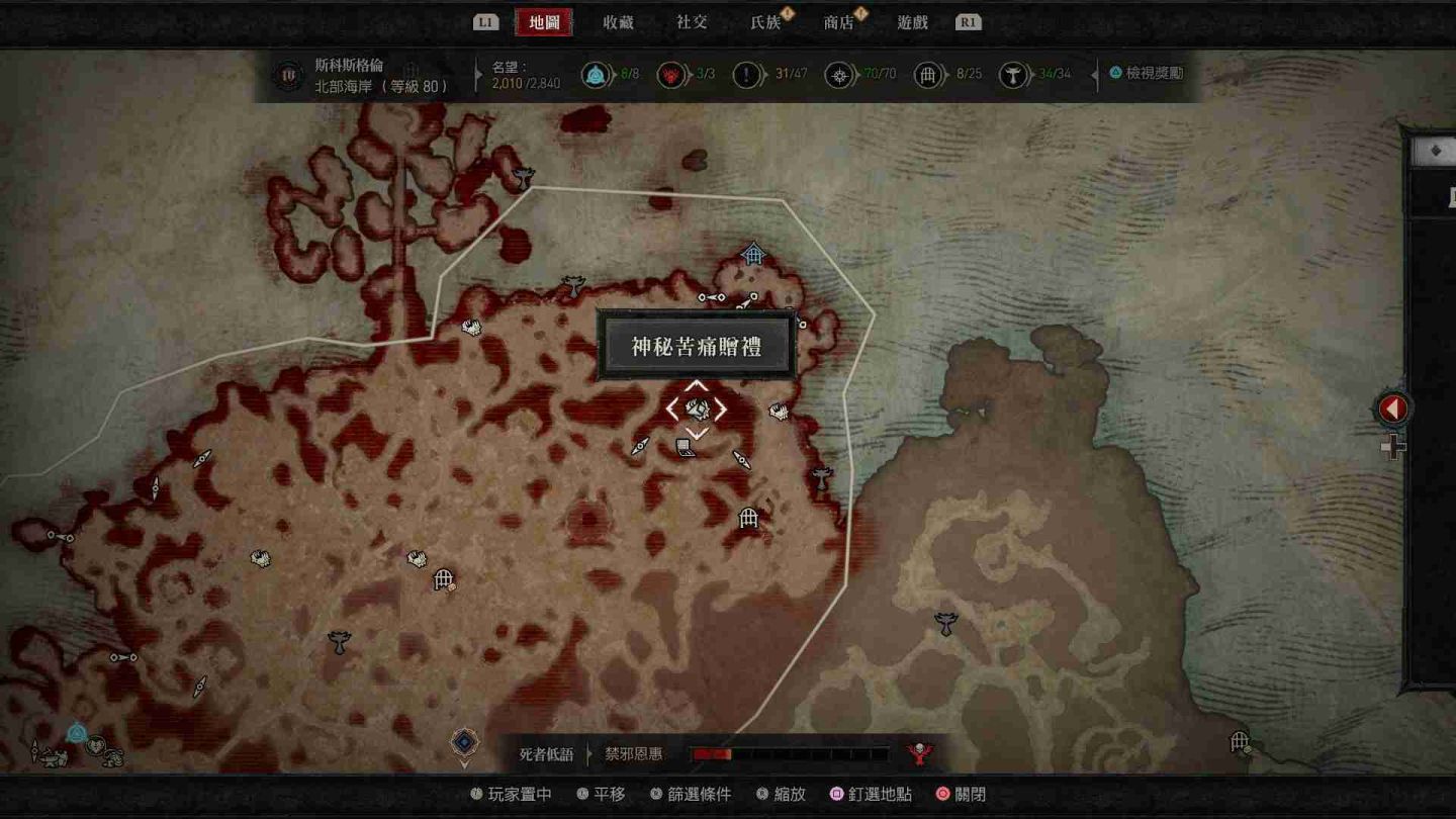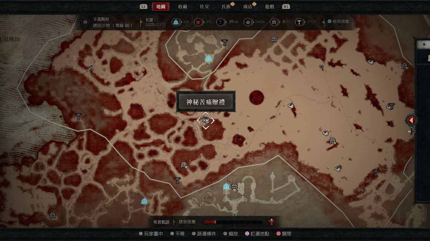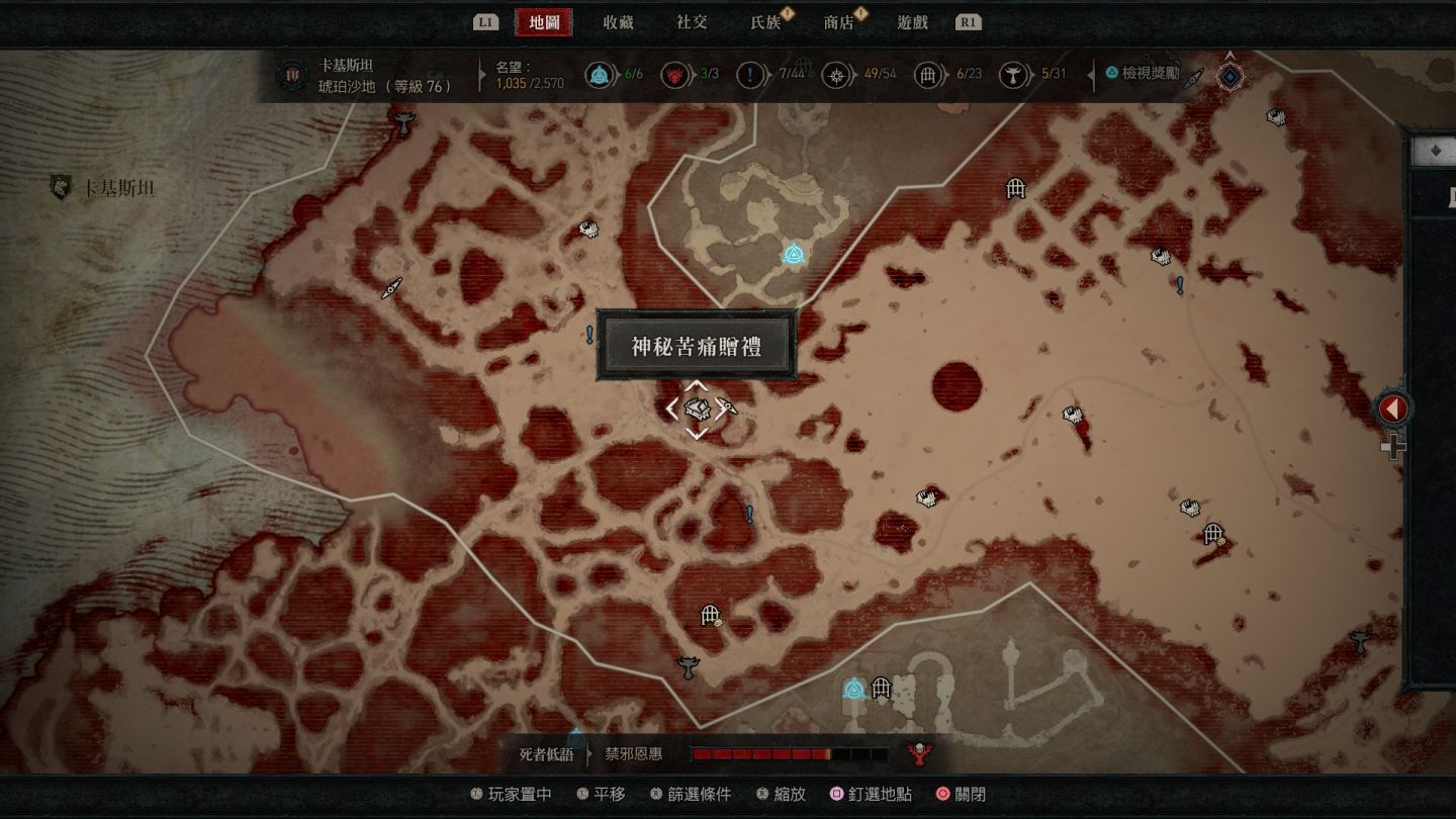 - 南部開闊地秘苦痛贈禮:傳送點南方的「船骸灣」山頂處以及傳送點東南方的「哈坎綠洲」邊緣小道區。