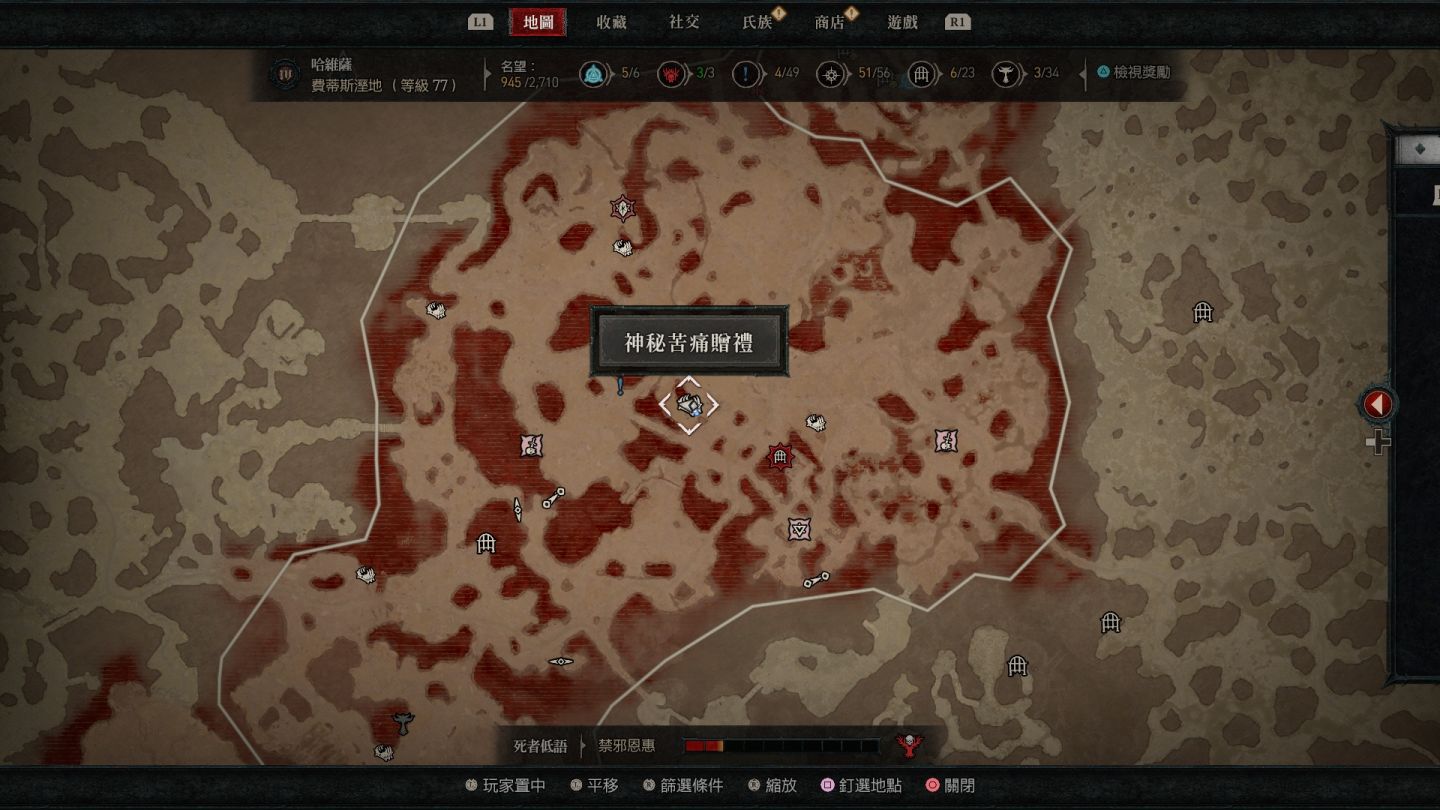 - 費蒂斯濕地神秘苦痛贈禮:傳送點西南方的「吞噬荒原」以及地圖最南方的「耗弱平原」。