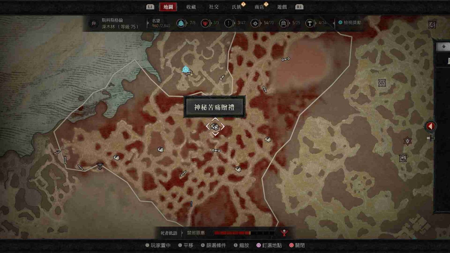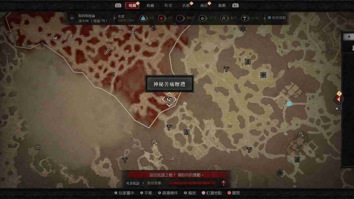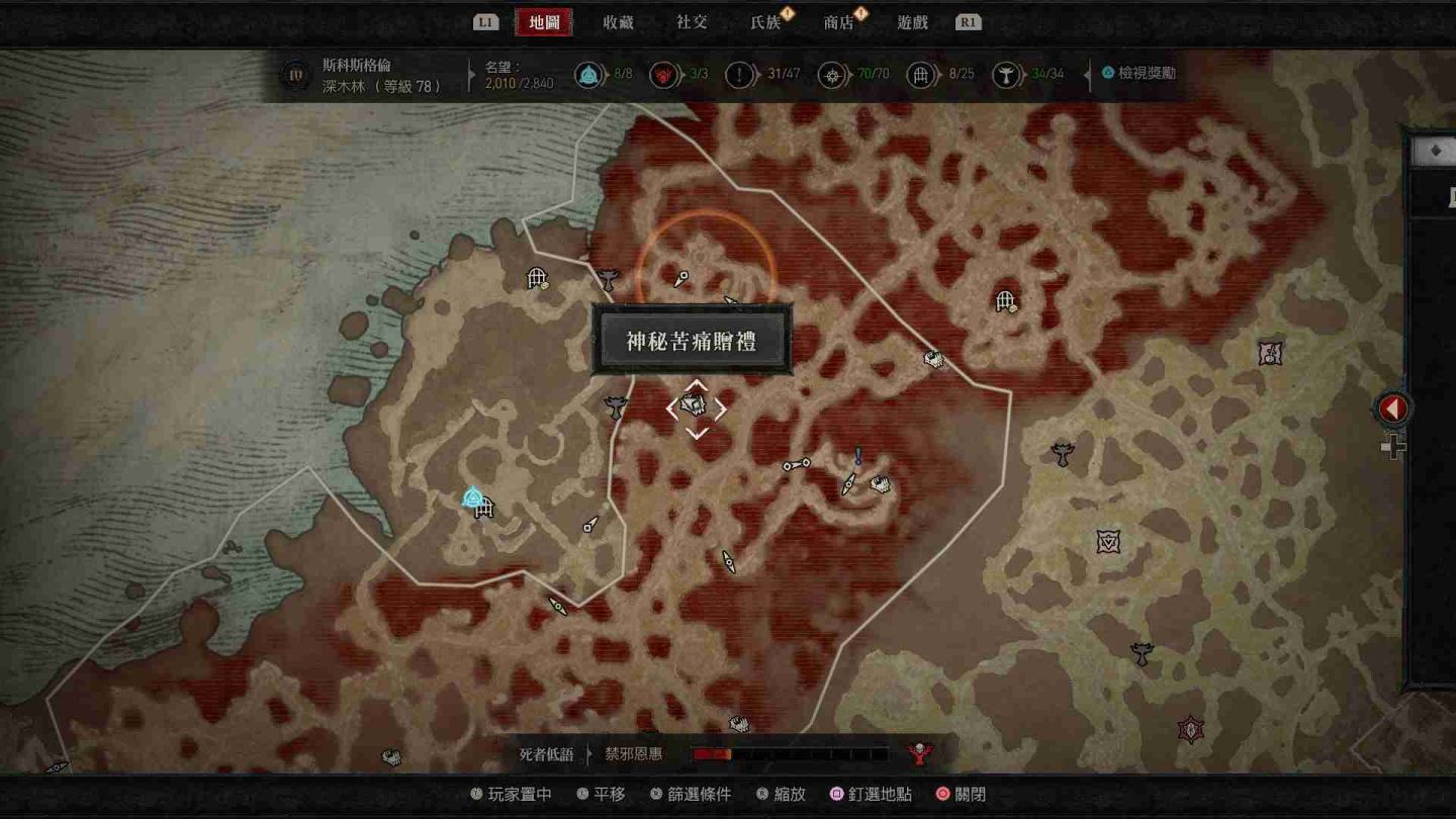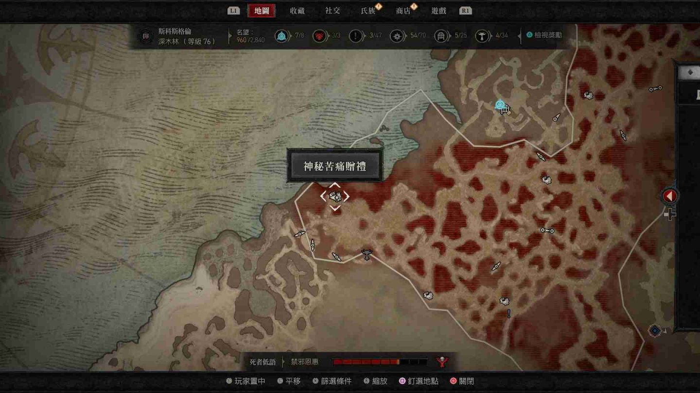 - 深木林神秘苦痛贈禮:傳送點西南方「瓦希里之境」、東北方「亡嚎荒野」、南方的「先祖林地」以及「伊薩莉亞高地」。