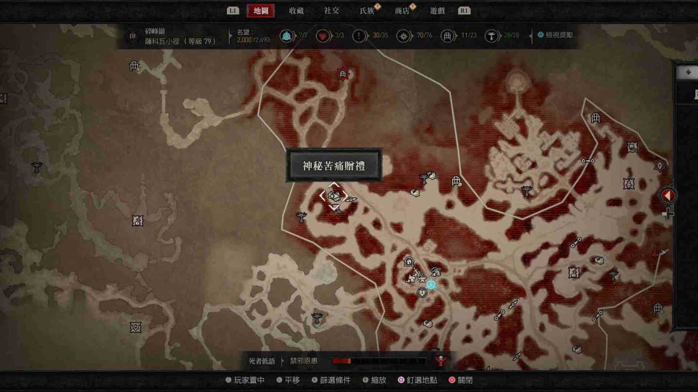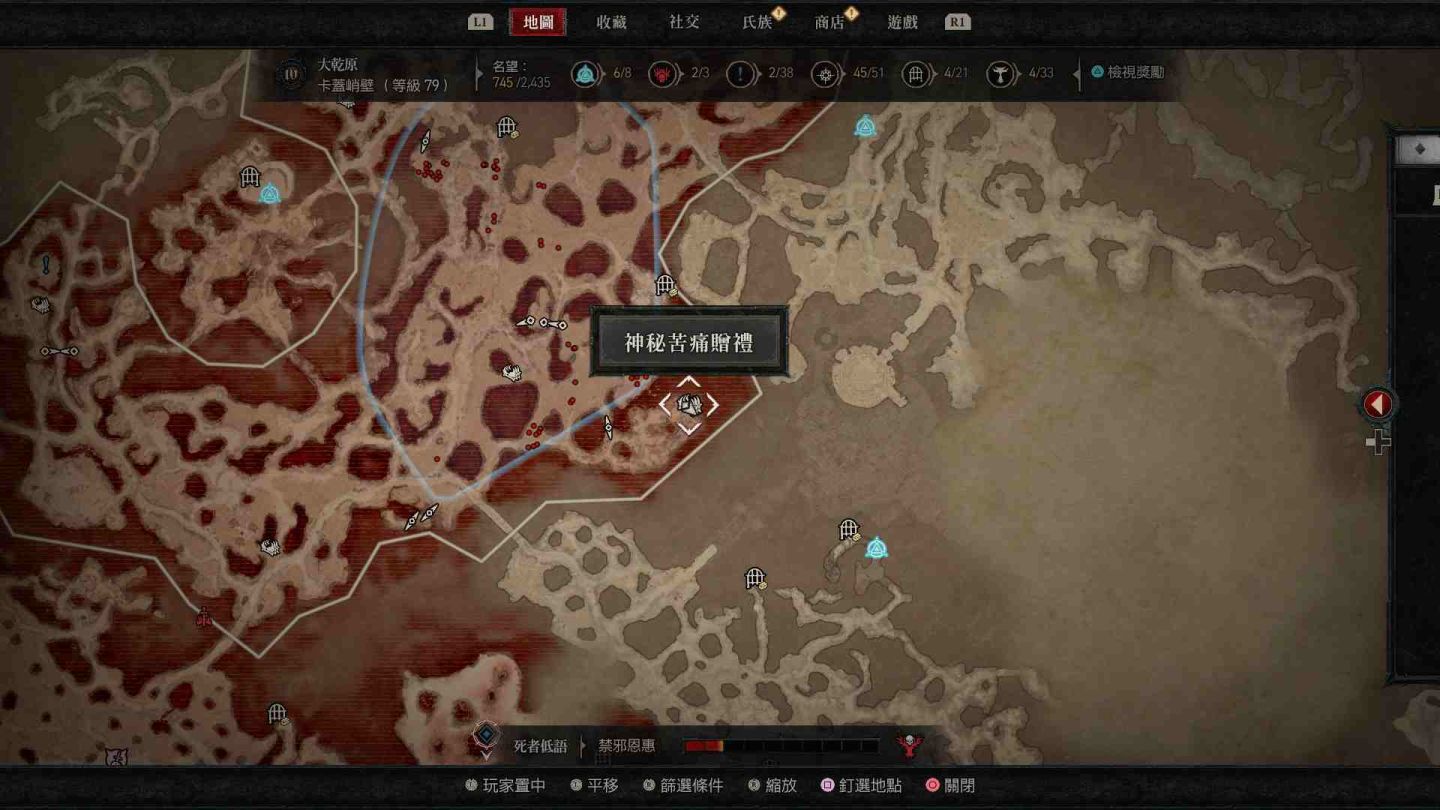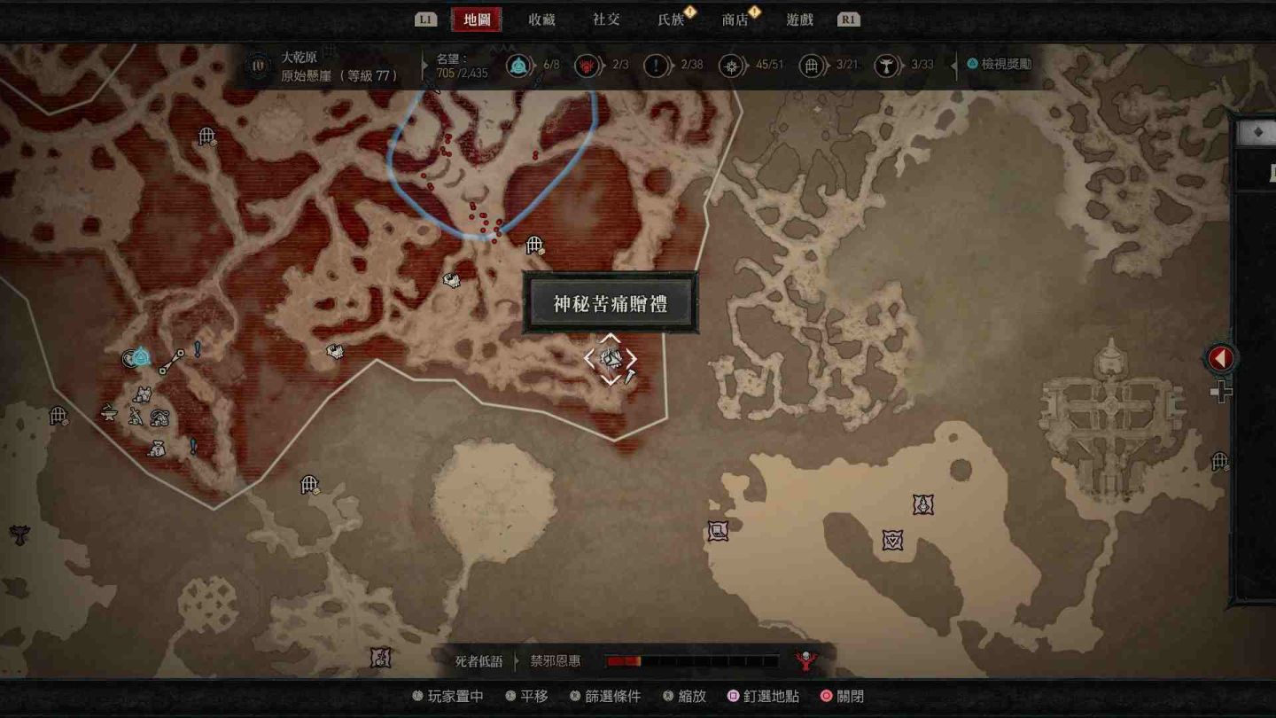 - 原始懸崖神秘苦痛贈禮:傳送點東方「荒寂之地」以及西北方「加特瑪灌木林」邊緣區域。