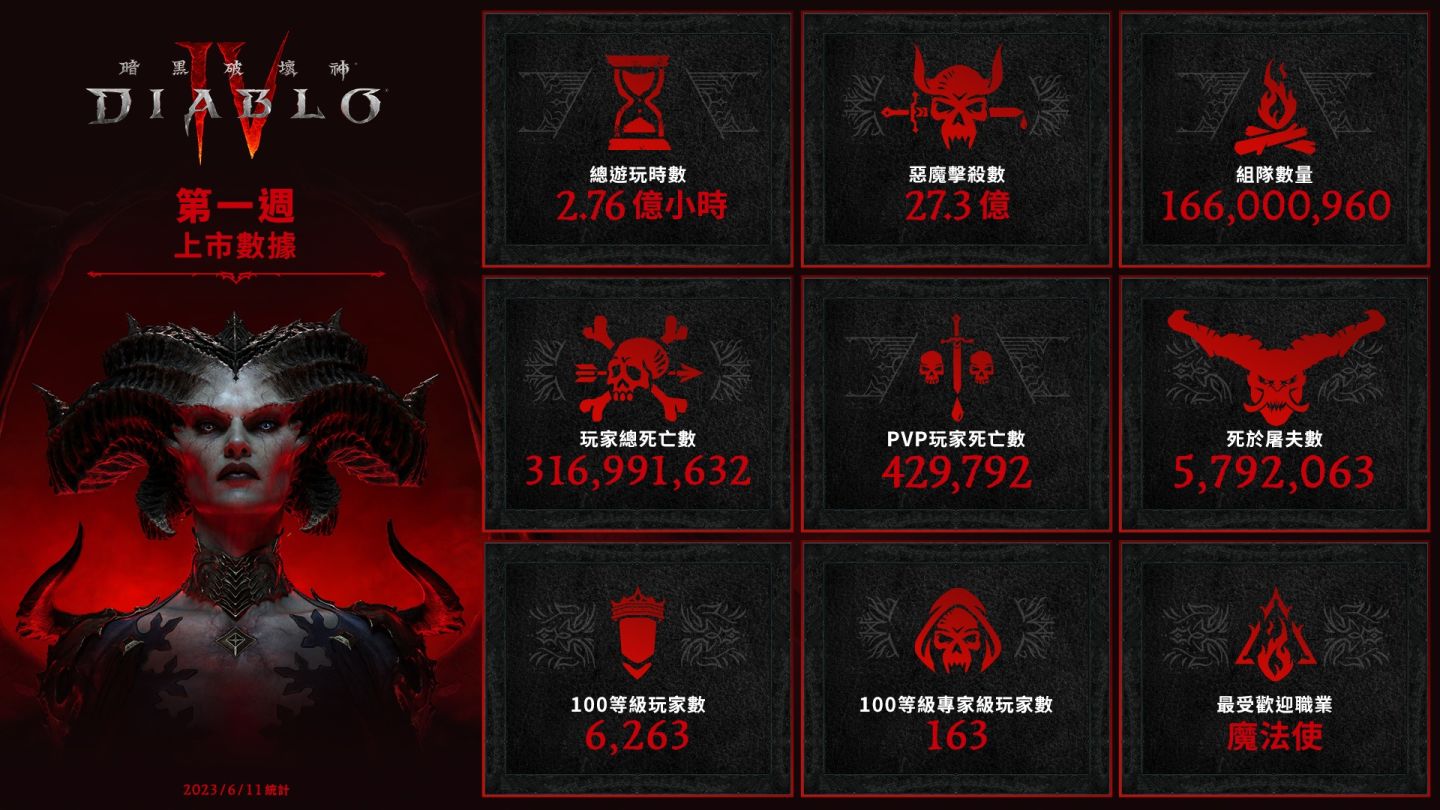 由暴雪娛樂(Blizzard Entertainment)推出的《暗黑破壞神4》(Diablo 4)於今(13)日公布,自 6/6 正式發售以來,《暗黑破壞神4》銷售額已超過 6.66 億美元,並公開遊戲中多項統計數據。