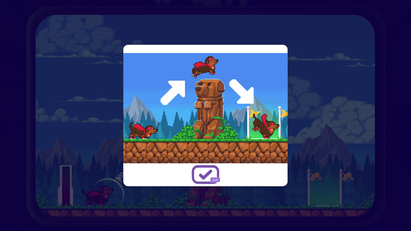 前路被障礙物阻擋,導致不能繼續前進該怎麼辦?完成可愛的像素小遊戲,引導小狗跳過、避開或進行其他動作,順利通過前方的障礙吧!