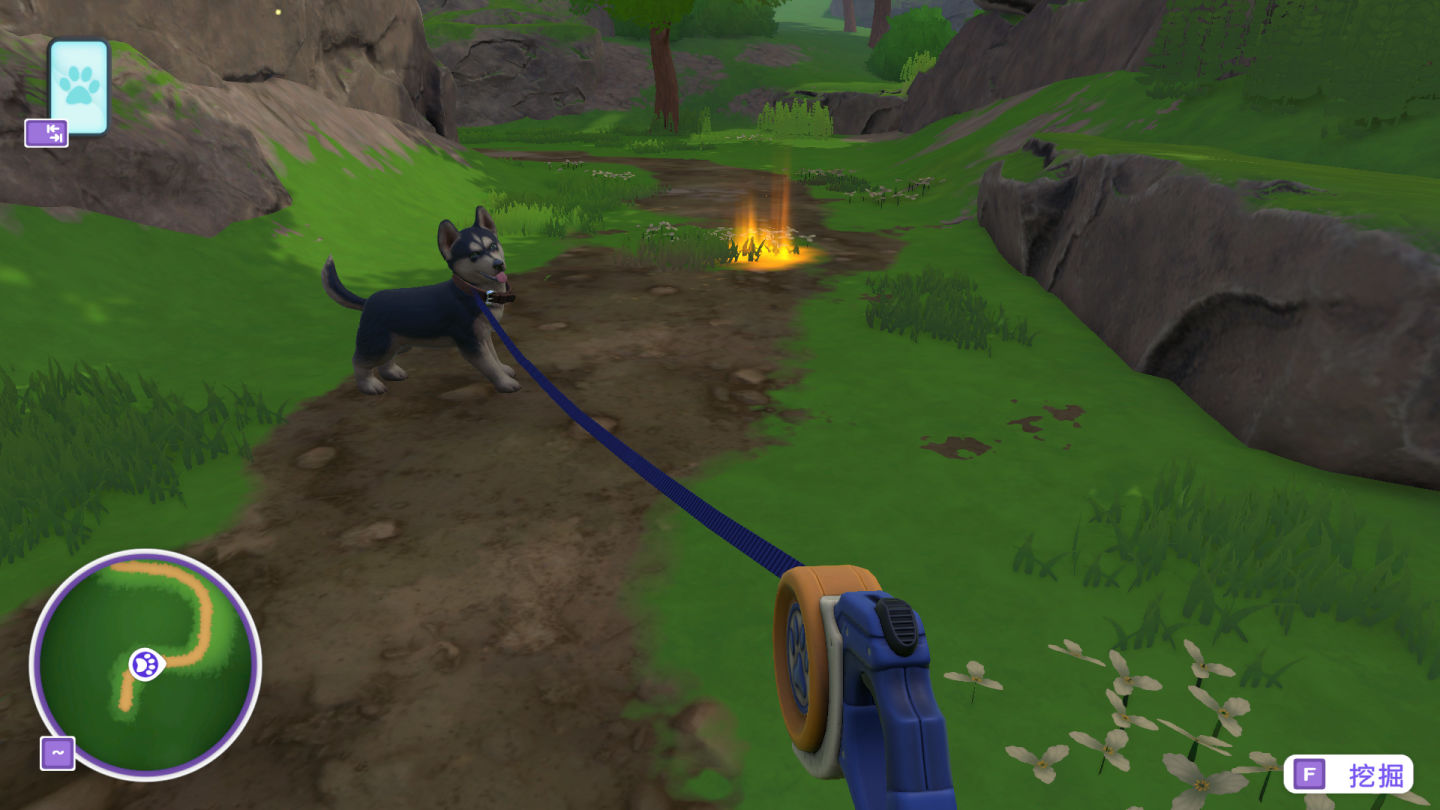 小狗突然聞到有趣的氣味並興奮起來!或許是地下埋藏著讓人意外的東西,走近發光的位置,讓小狗進行挖掘,或許會得到驚喜禮物、甚至是骨頭幣喔!