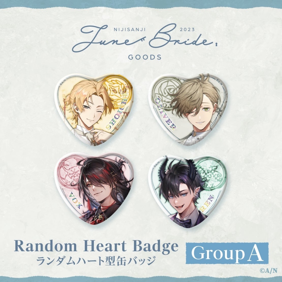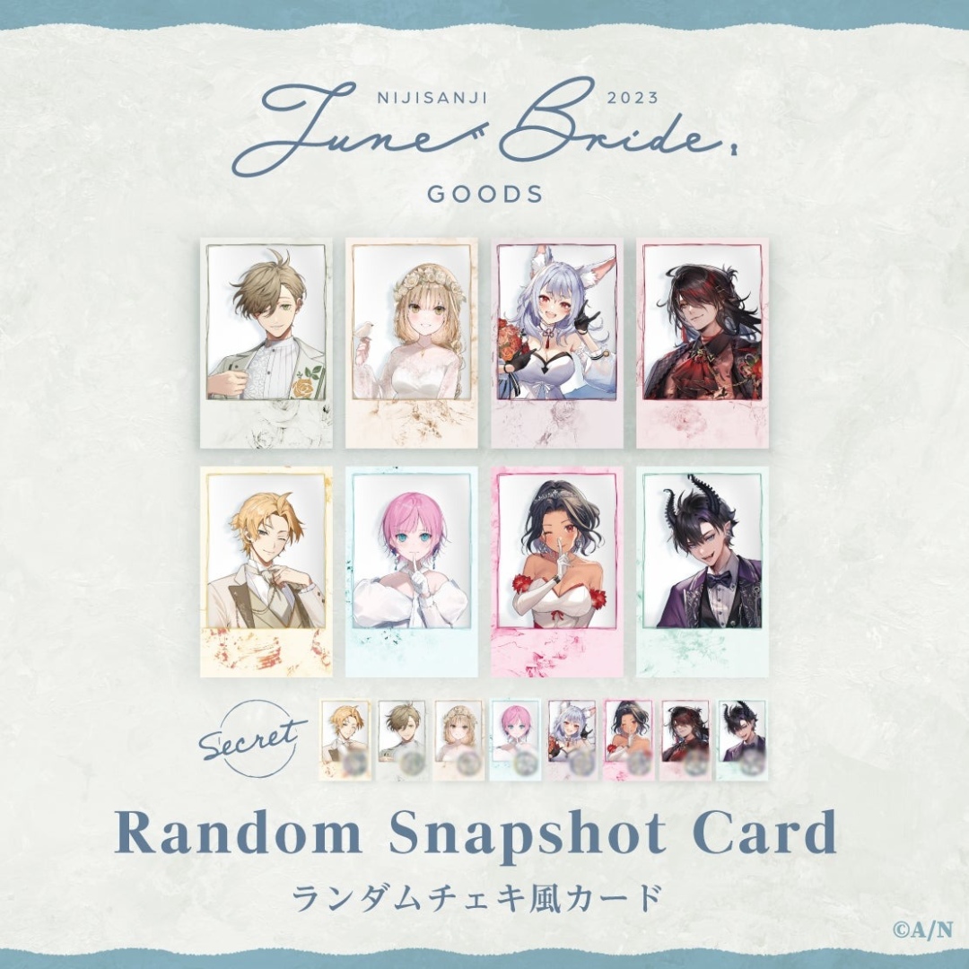 周邊部分包含拍立得風卡片、壓克力立牌、心型徽章、鑰匙造型吊飾、角色印象項鍊組、此外還會販售超過百位以上來自彩虹社與 NIJISANJI EN 的 Vtuber 參加「六月新娘 2023」主題語音以及擔當主視覺圖的八人組合語音,想要感受六月幸福氣息的粉絲們不要錯過!