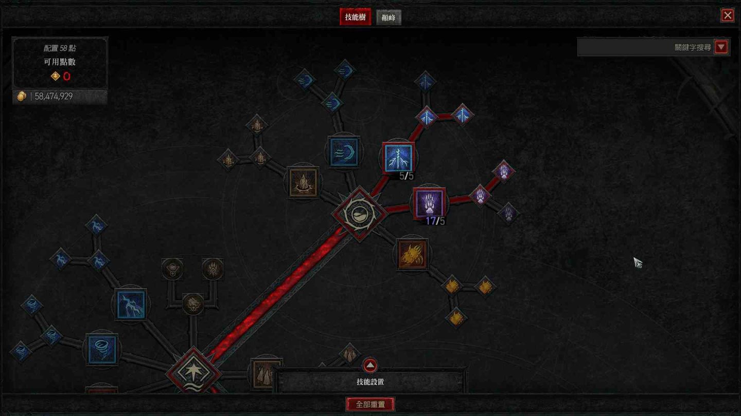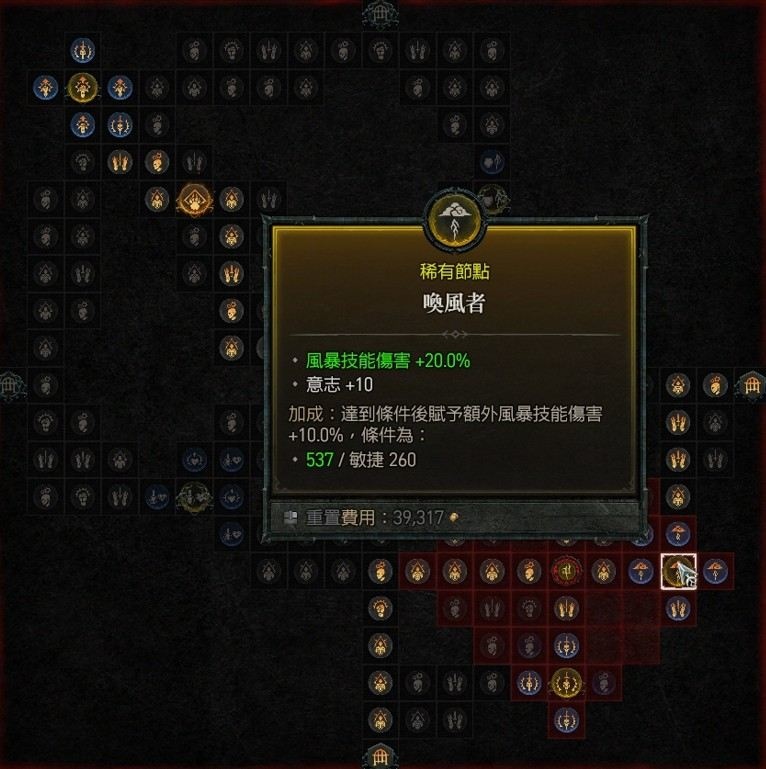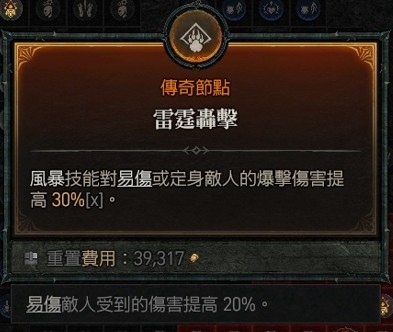 第一個延伸面板會建議選擇「雷霆轟擊」,拿下傳奇節點外,建議將提高爆擊傷害及風暴技能傷害的稀有節點拿下