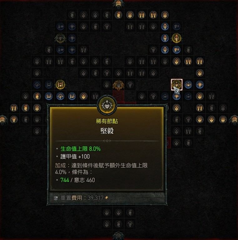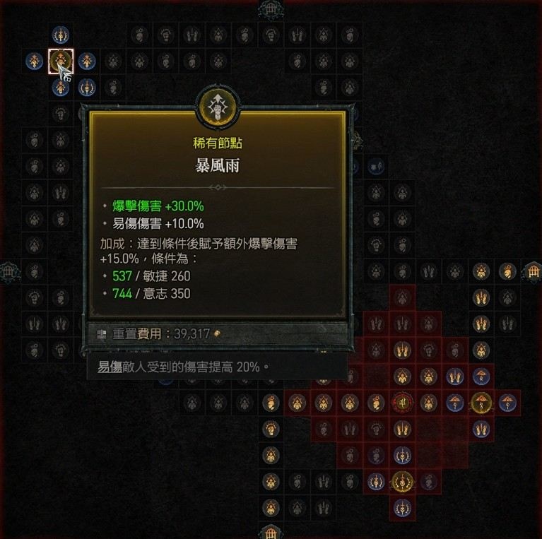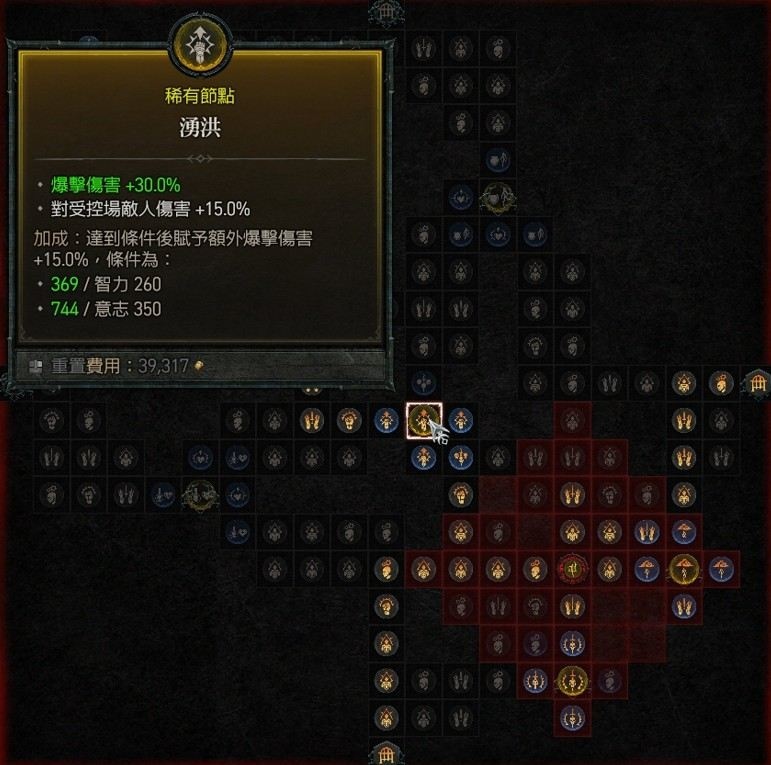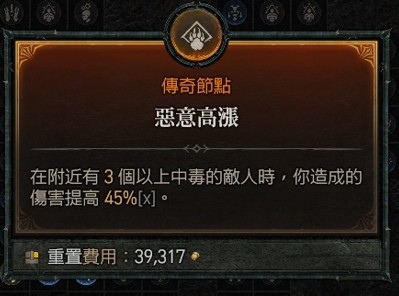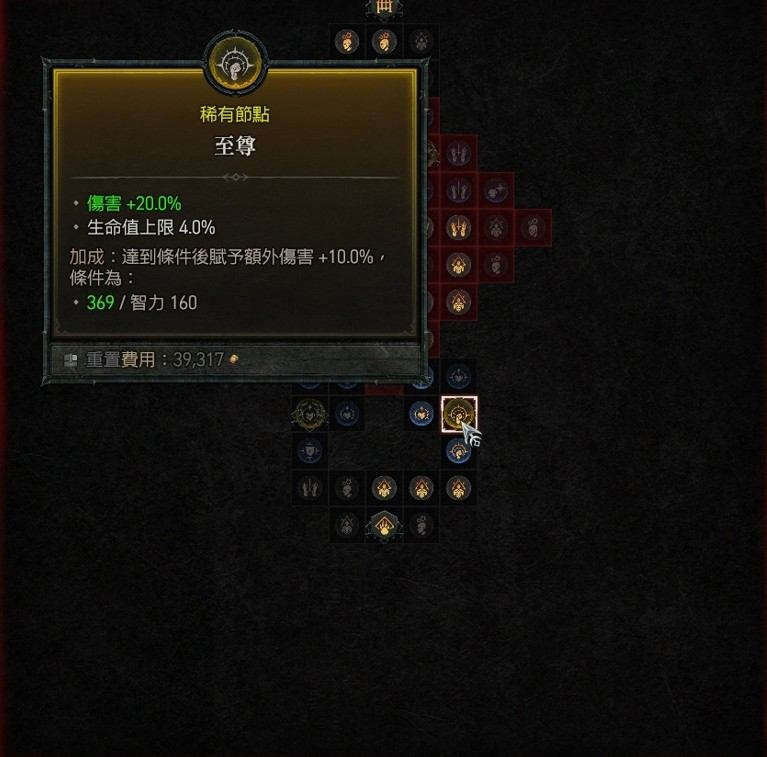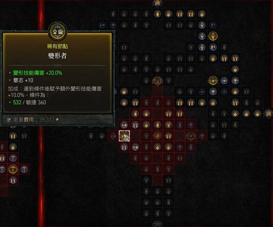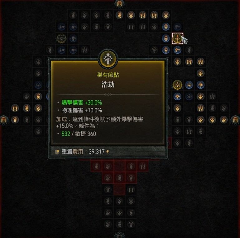 該塊面板有爆擊傷害、攻速以及變形技能傷害提升,但傳奇節點無用不必投資。
