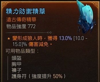 減傷有許多選擇,當前主流是「致衰狂吼」,可讓周遭敵人在 4 秒內造成的傷害減少 70%,而精華能讓狼人化的灰熊狂怒也能施展更實用