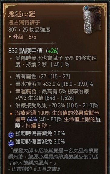 全職業生存首選裝備,流派配置有不少治療手段有不錯表現。但沒有針對屏障觸發,因此傳奇褲子替代調整也不見得會比較差。