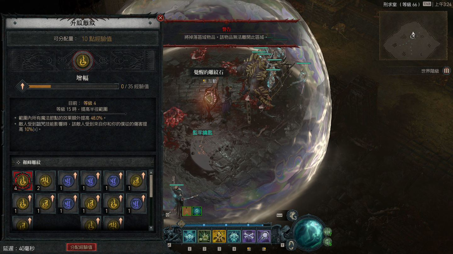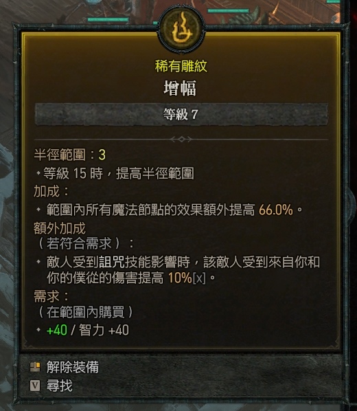 雖然可以任意插拔,但玩家可能會注意到,每個雕紋都還有等級設定。黃色雕紋在 15 級時還能增加影響範圍。這也是《暗黑破壞神4》後期加強能力的手段之一,同時也是非常拖台錢的設計。因為唯一取得雕紋經驗值的來源,只有使用噩夢徽記開啟噩夢地城,通關後才能得到些許經驗值。由於經驗值真的非常少,建議先集中在一兩個必用雕紋上來獲得能力,升到 15 級加大範圍後再考慮點其它雕紋。