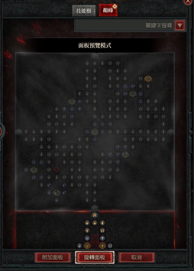 而第三個面板就不用考慮往下個柵口路徑,專心點出傳奇、稀有、刻印即可,專注在能點到這邊也差不多 80 級左右,在打法已建立的狀況下,顛峰點可以專心用來提升數值能力,甚至傳奇效果不好用的話也能略過,以強化角色重點素質為主。