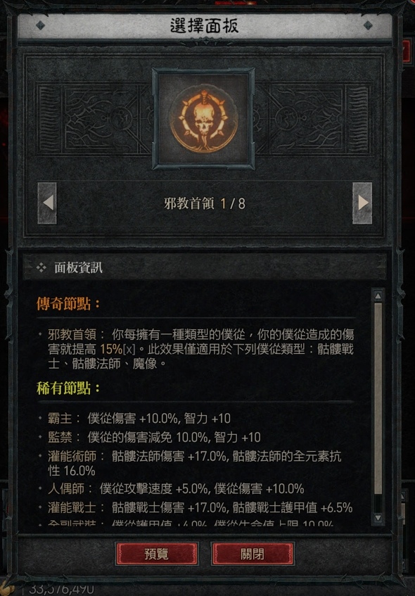 要開啟新面板,只要點擊已開放的「面板連接柵口」節點,就可以進入面板選擇畫面,這邊會詳細列出該張面板上能點出的傳奇與稀有節點能力。