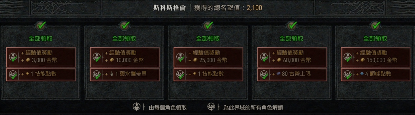 這些點數可以用來點新開啟的顛峰盤介面,除了獲得屬性加成之外,還可以針對流派進行強化,是 50 級後重點提升系統,部份流派甚至非常依賴顛峰盤才能穩定成型。除了透過升級取得顛峰點之外,區域名望最後的獎勵也有 4 點顛峰點,五個區域全拿有 20 點,相當於多出五級的能力,差距很大,非常推薦取得。