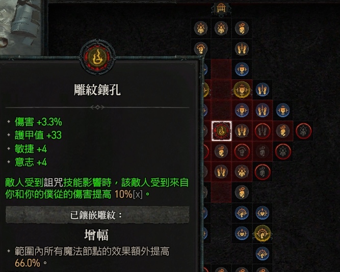 在面板底下有許多不同的雕紋,這些雕紋可以嵌進「雕紋鑲孔」節點中,觸發它的功用。以第一張面板來看,「雕紋鑲孔」在最中央的位置,玩家必須一路點上去,把鑲孔也點開後,就可以把雕紋放進去啟動能力了。