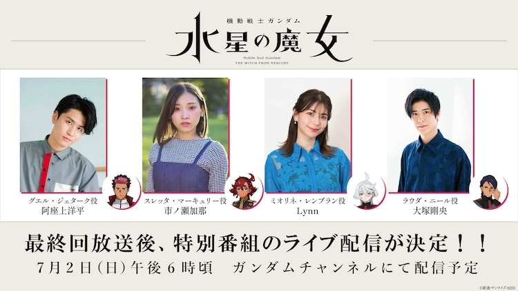 本週日(7/2)將播出《機動戰士鋼彈 水星的魔女》最終回,在日本方面播畢後,將在 YouTube 的鋼彈官方頻道播出主演聲優登場的直播特別節目。預計請到聲演蘇蕾塔的市之瀨加那、聲演米奧琳涅的 Lynn、聲演古爾的阿座上洋平、聲演勞達的大塚剛央,趁著最終回的餘韻展開熱烈的討論!