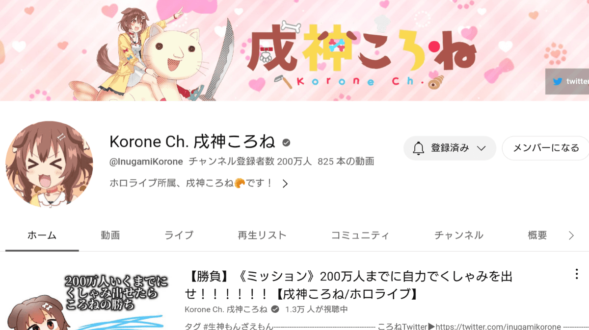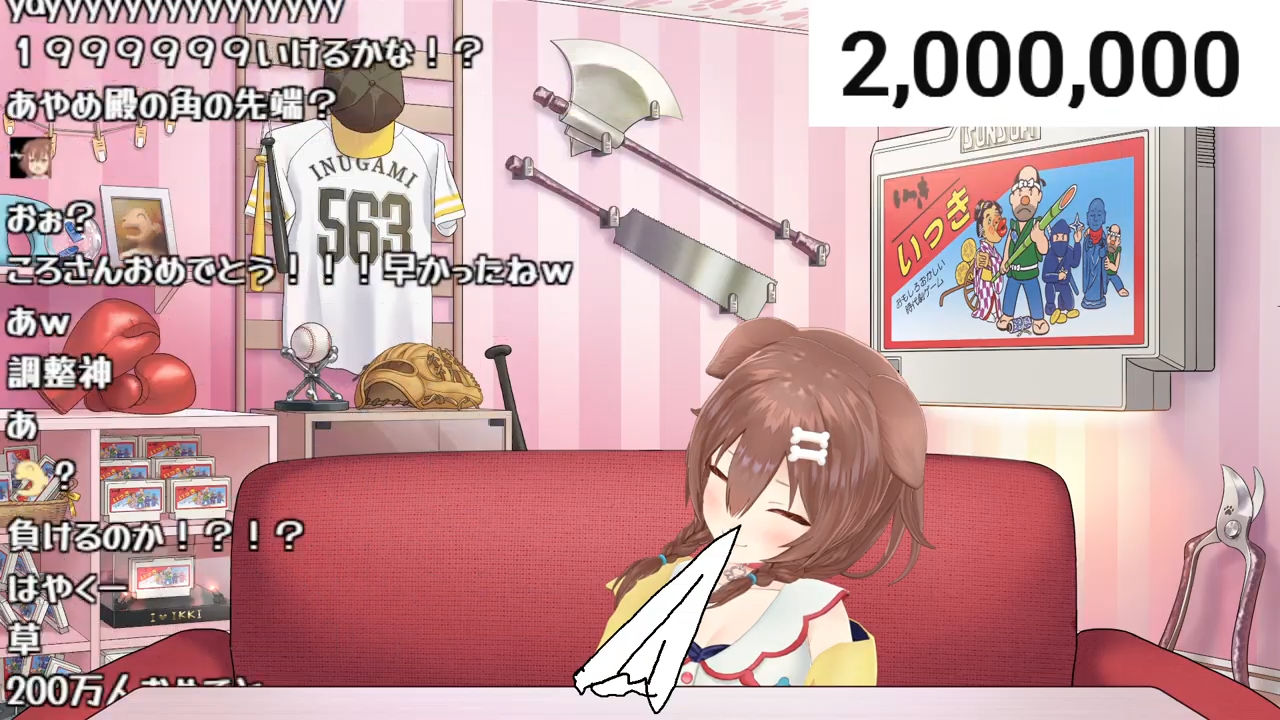 hololive Gamers 成員「戌神沁音」(戌神ころね)於今(28)日晚間的直播中,Youtube 頻道訂閱人數突破 200 萬人,成為 hololive 第七個(日本成員第四個)訂閱數達到兩百萬的 Vtuber。