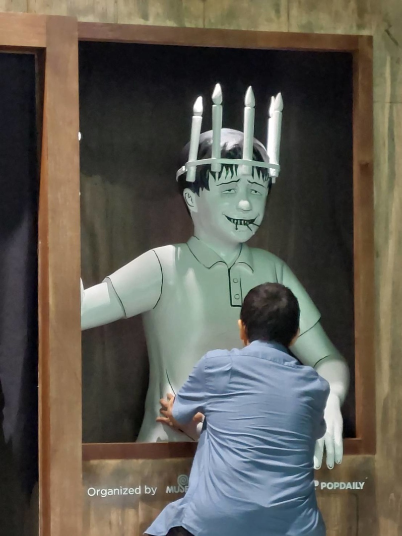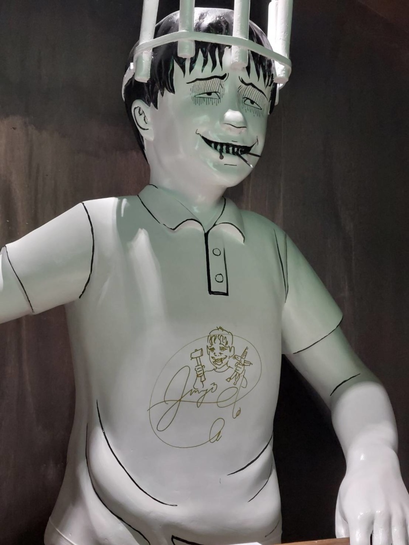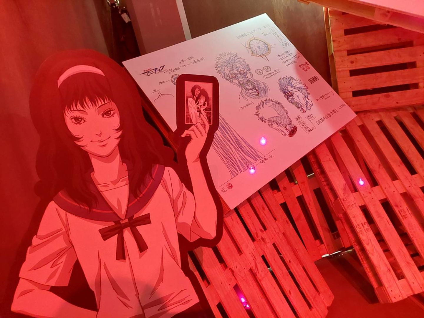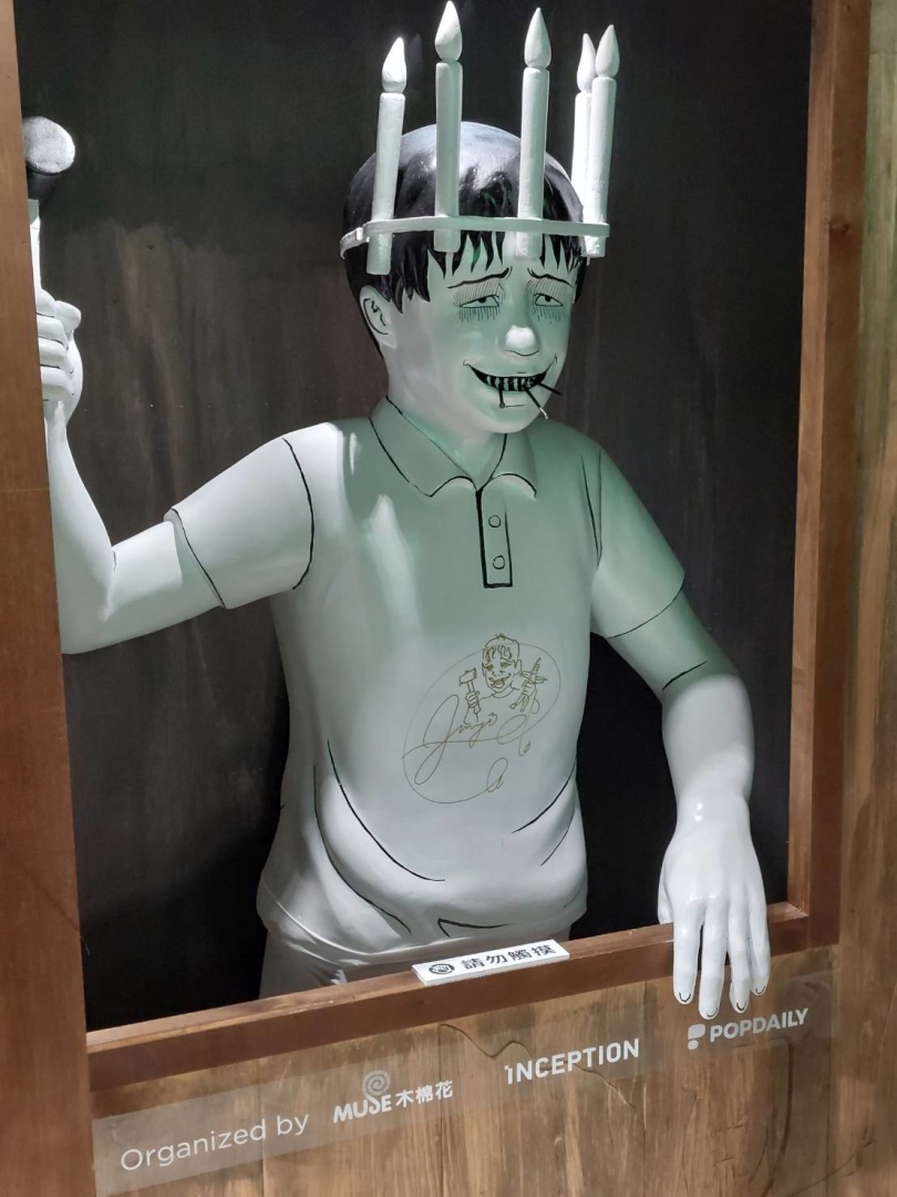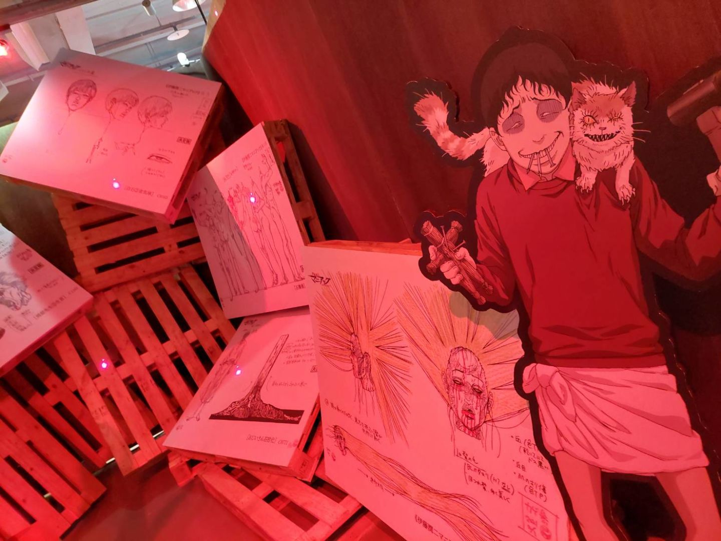 除了需要親自體驗的「償命村」&「喚惡鎮」之外,特別安排的美術展區展出多張《伊藤潤二狂熱:日本恐怖故事》複製原稿、伊藤老師的訪問影片,特別值得一提的是《漩渦》的裝置藝術展品中以立體雕塑重現「人肉漩渦」,將漫畫中最經典卻令人毛骨悚然的那一幕實際呈現,唯一慶幸的是展品沒有上色,若再增加顏色這個元素,想必會再次顛覆粉絲們過去看漫畫時的恐怖印象。