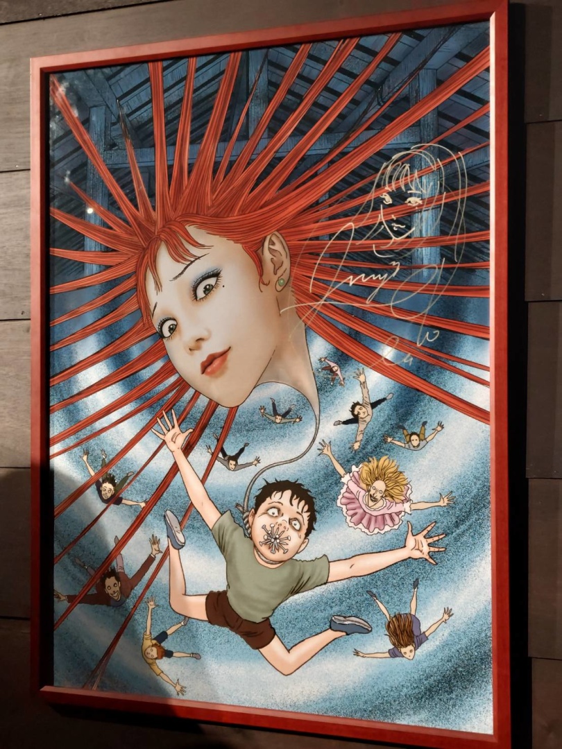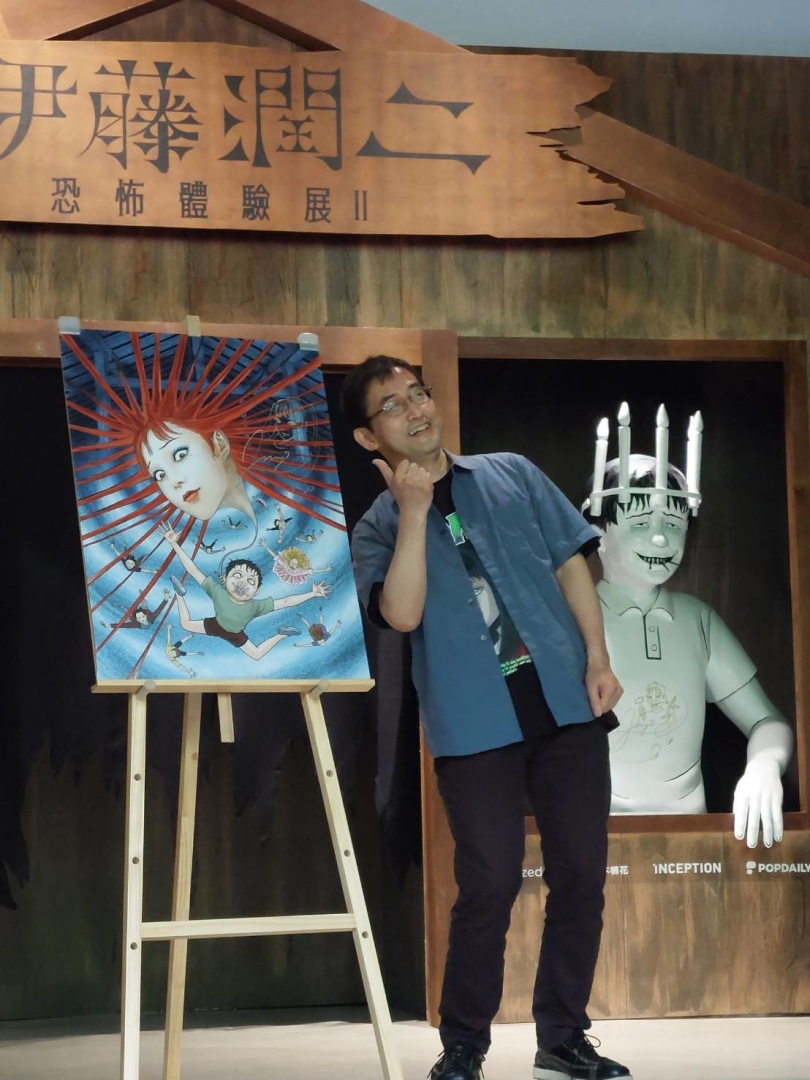 開幕活動中也為這次「伊藤潤二恐怖體驗展2」揭開特別繪製的創作,可以看到富江變成人頭氣球,繩子緊緊的纏在雙一脖子上,富江的長髮則以《閣樓的長髮》為靈感,延伸掛在屋樑上,而下方飛在漩渦之中的還有出現在其他篇章的角色,大家可以來找找看認識幾個角色。老師希望大家特別注意雙一的表情,明明是一個很恐怖的場景,他卻露出了好像有點享受的表情,就像這次的「伊藤潤二恐怖體驗展2」,希望可以帶給大家恐怖中的愉悅。