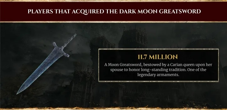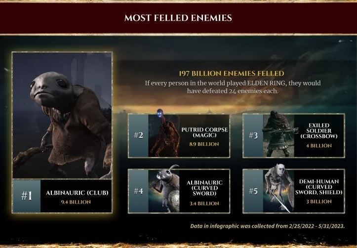 而數據中也顯示,至目前為止,玩家總共擊敗 1970 億個敵人,相當於地球人口 24 倍。最常被玩家殺死的怪物為持棍白金之子,記有 94 億次,其次為腐爛長生者 89 億、流亡士兵 40 億、持彎刀白金之子 34 億,以及持彎劍亞人 34 億次。