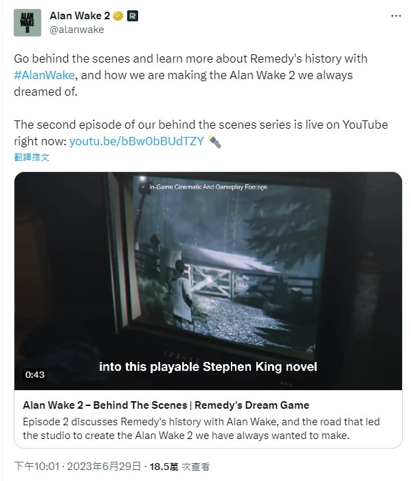 芬蘭 Remedy Entertainment 預定 2023 年 10 月 17 日起在 PS5/Xbox Series X|S/PC 等平台上推出的心理驚悚恐怖遊戲《Alan Wake 心靈殺手2》,公開新製作花絮影片,為玩家們解析實現續篇開發過程的經緯與設計概念。