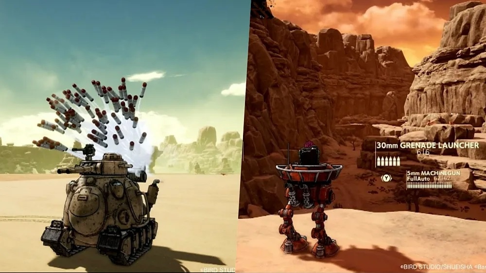 至於跳躍機器人,則是可活用跳躍力高速,攀登或是利用高空跳躍進行踩踏攻擊,給予廣範圍敵人傷害的載具。而且這兩個載具除了戰鬥外,也將會在探索中提供玩家極大助力(例如可利用戰車砲擊擊碎擋路岩石,或是利用跳躍機器人爬上高處探索移動),玩家可透過這次公開的影片,先來確認這兩部載具各自不同的魅力與特色。