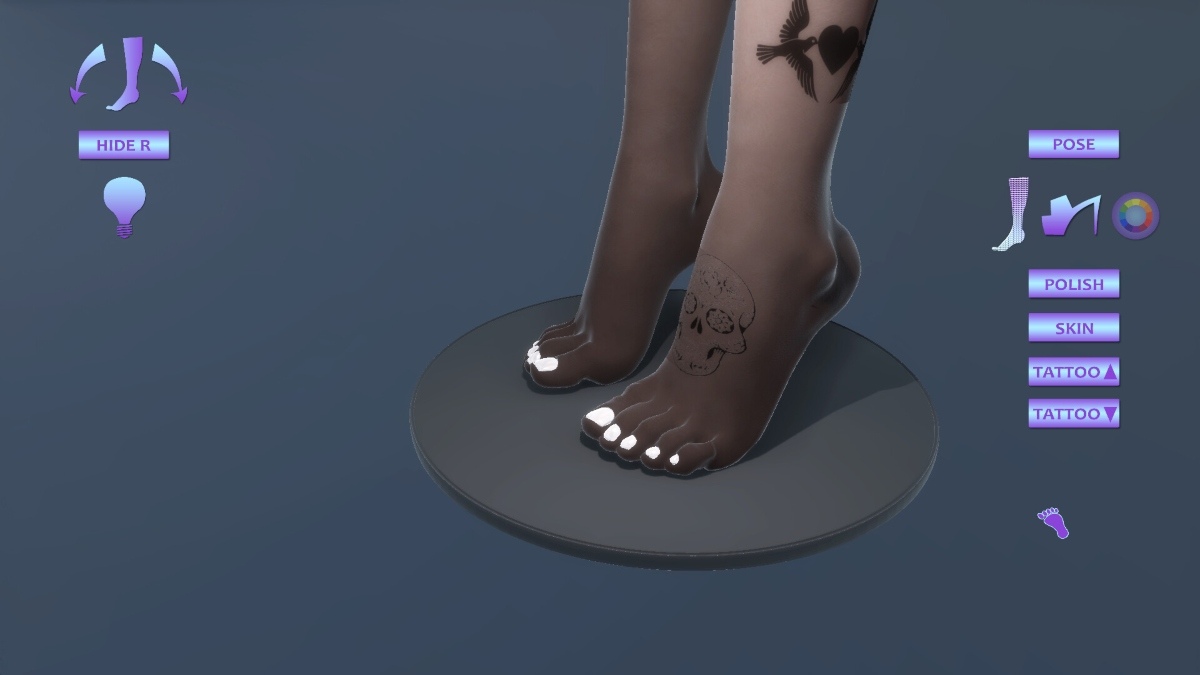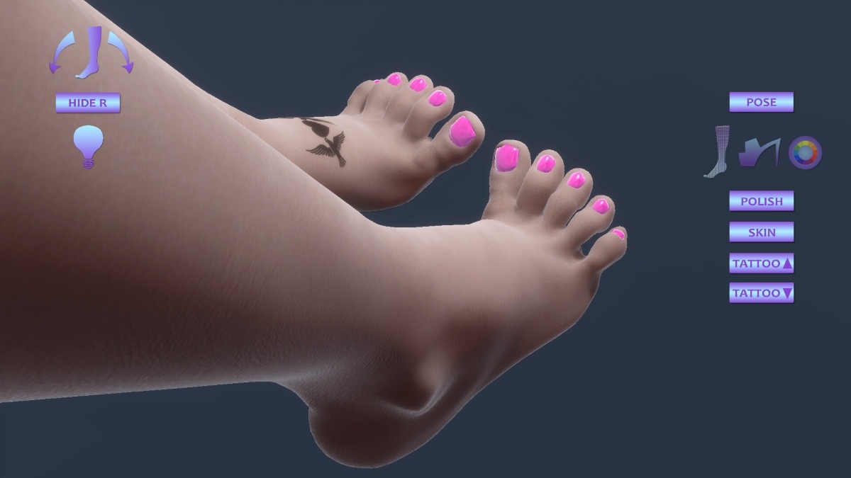 而透過不同照明,也讓美腳拍出的角度光暗產生不同變化,搭配肌膚顏色變更,讓自己的美腳看起來更加美觀。同時,玩家也可以針對美腳設定各種姿勢,例如調整雙腳的方向角度,搭配照明光暗與各種刺青跟美甲組合,讓自己的腳部美麗程度更上一層樓!