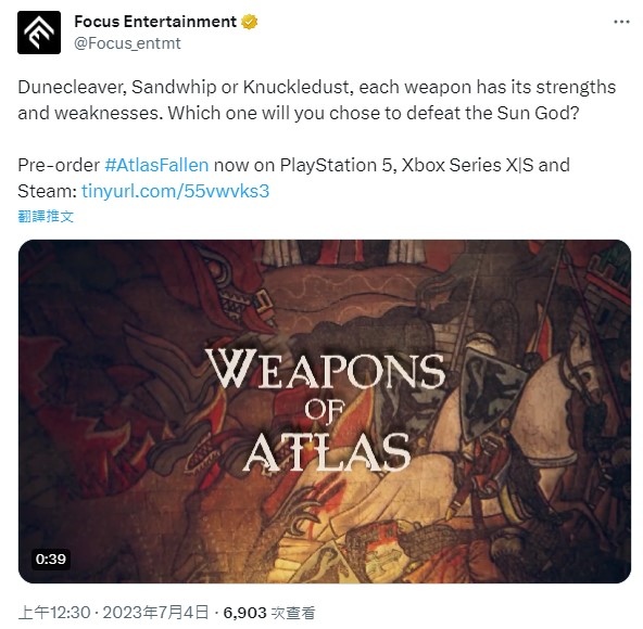 Deck13 開發、Focus Entertainment 預定歐美時間 8 月 10 日/亞洲時間 8 月 11 日在 PC Steam/PS5/Xbox Series X|S 等平台上推出,並支援繁體中文等語系的動作冒險 RPG《Atlas Fallen 亞特拉斯的殞落》(中文名暫稱),再度釋出最新展示影片,讓玩家確認本作登場的豐富武器類型與戰鬥演出模樣。