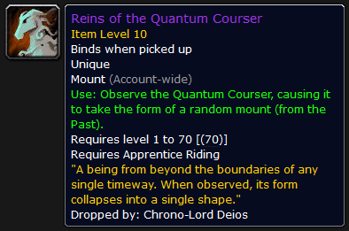 有個座騎清單讓玩家隨機抽座騎,不會涵蓋全座騎,但可以透露斯坦索姆的「死亡戰騎韁繩」、「恆龍時間劫奪者韁繩」是有的,而且應該不包括任何「購買」的商城與遊戲商人中購買座騎,以玩家從首領或者是地城掉落的座騎為主,而且玩家可以重複取得「量子巡遊者韁繩」來收集座騎。