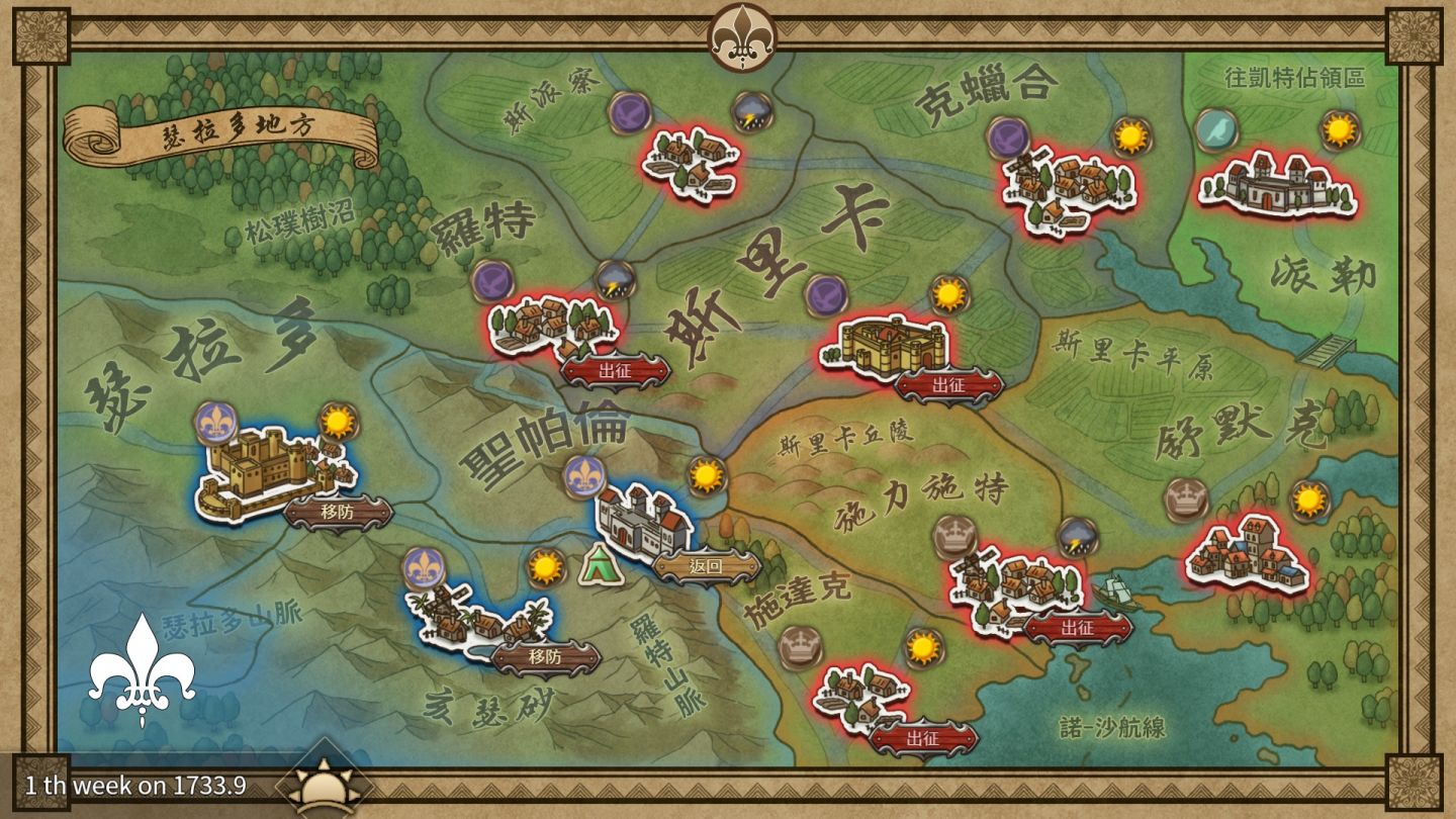 戰爭之外,玩家可以在領地中實行【治安】以提升徵兵量、降低遇上盜賊的機率、【徵兵】增加可用士兵數量,回到軍團營地可進行【訓練】增加士氣,以在後續戰場獲得更好的戰鬥表現。