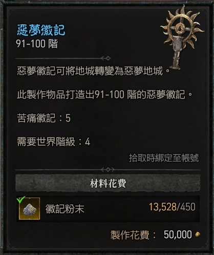 在世界 4 苦痛難度下,玩家可以使用惡夢徽記,將地城轉換為惡夢地城,而該地城的怪物難度等級為 54 + 徽記階級,也就是說在 100 階的惡夢地城中,玩家必須面對 154 級的敵人。即使是一般模式,要通關 100 階惡夢地城也是非常不容易的事,除了技能配裝必須有一定水準之外,許多細節也都必須留意才能通關。