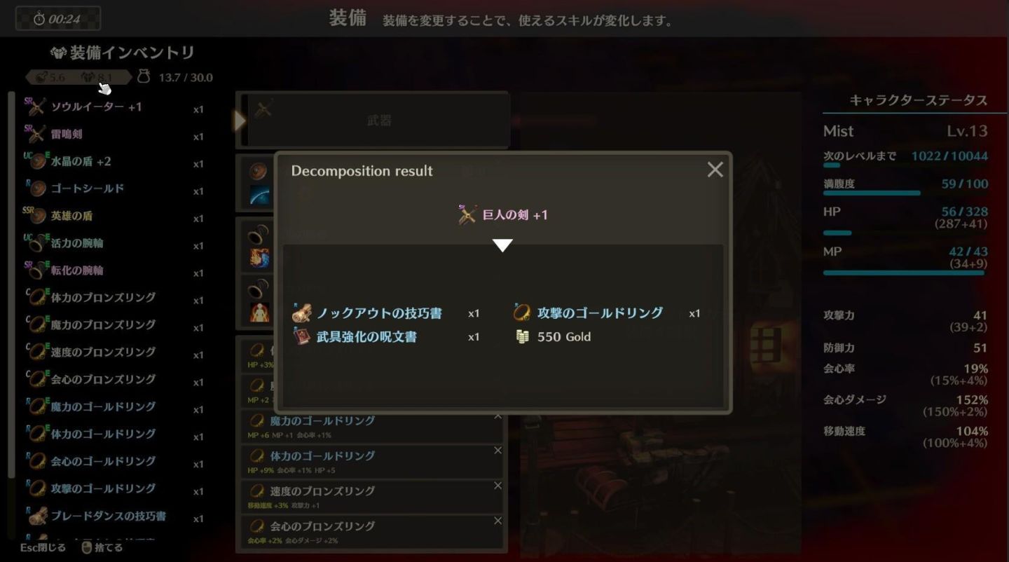 此外,新增了裝備的「分解」系統。透過在裝備畫面中將各種裝備(武器・盾牌・手環・戒指)進行分解,可以獲得技巧書和道具。除了將自己過去使用的技巧書從裝備中取下外,還有可能獲得僅通過分解才能得到的道具。或許可以將不需要或不再使用的裝備品進行分解以充分利用…!?