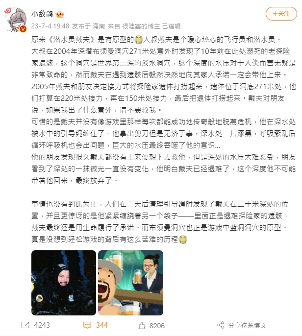 而在正式發售沒多久,中文圈網路也開始流傳其角色原型為戴夫.肖(Dave Shaw)的故事。現實中的戴夫是一位澳洲民航機機師,據 wiki 記載,1999 年時 45 歲的他開始接觸潛水,在持續精進技術與裝備下,他也開始挑戰更高難度潛水,並與友人唐•雪利(Don Shirley)達成多項潛水記錄。