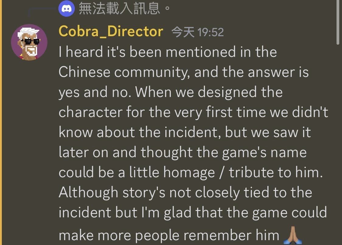 「最初在設計角色時我們並不知道這個故事,但後來我們得知這個事件經過後,覺得遊戲名字可以稍微對他致敬、紀念。雖然遊戲故事與該事件並無密切關聯,但我很高興這款遊戲讓更多人能記得他。」