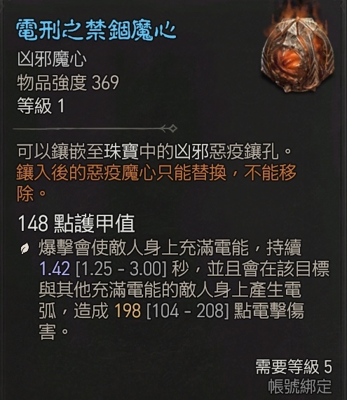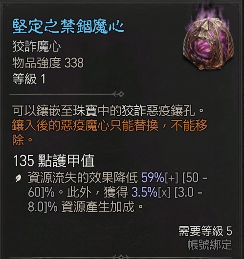 禁錮魔心功用類似於《暗黑破壞神3》傳奇寶石,玩家可以將它鑲進項鍊或戒指上,為裝備帶來額外的強大效果。要注意禁錮魔心有四種不同顏色類別,項鍊戒指上也必須擁有符合的鑲孔,才能將禁錮魔心鑲嵌進去。