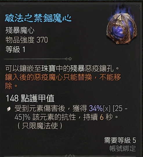 - 破法(殘暴,防禦):受到元素傷害後,獲得 20-40% 該元素的抗性,持續 5 秒。
