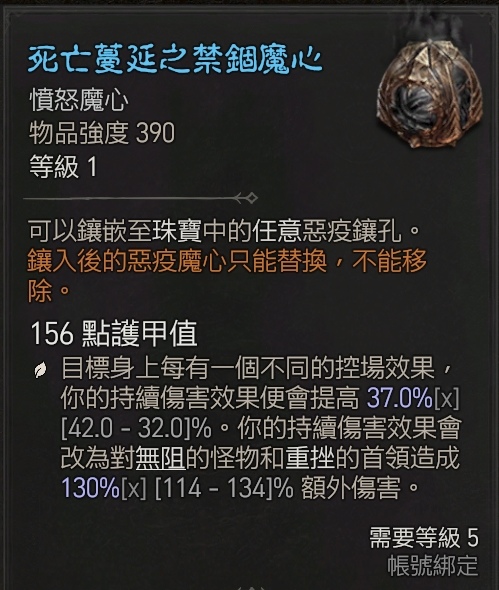 - 死亡蔓延(憤怒,特殊):目標每承受一個控場效果,你的持續性傷害效果就提高 30-40%。無阻的怪物與重挫的頭目所受到的持續性傷害將改為 110-130%。