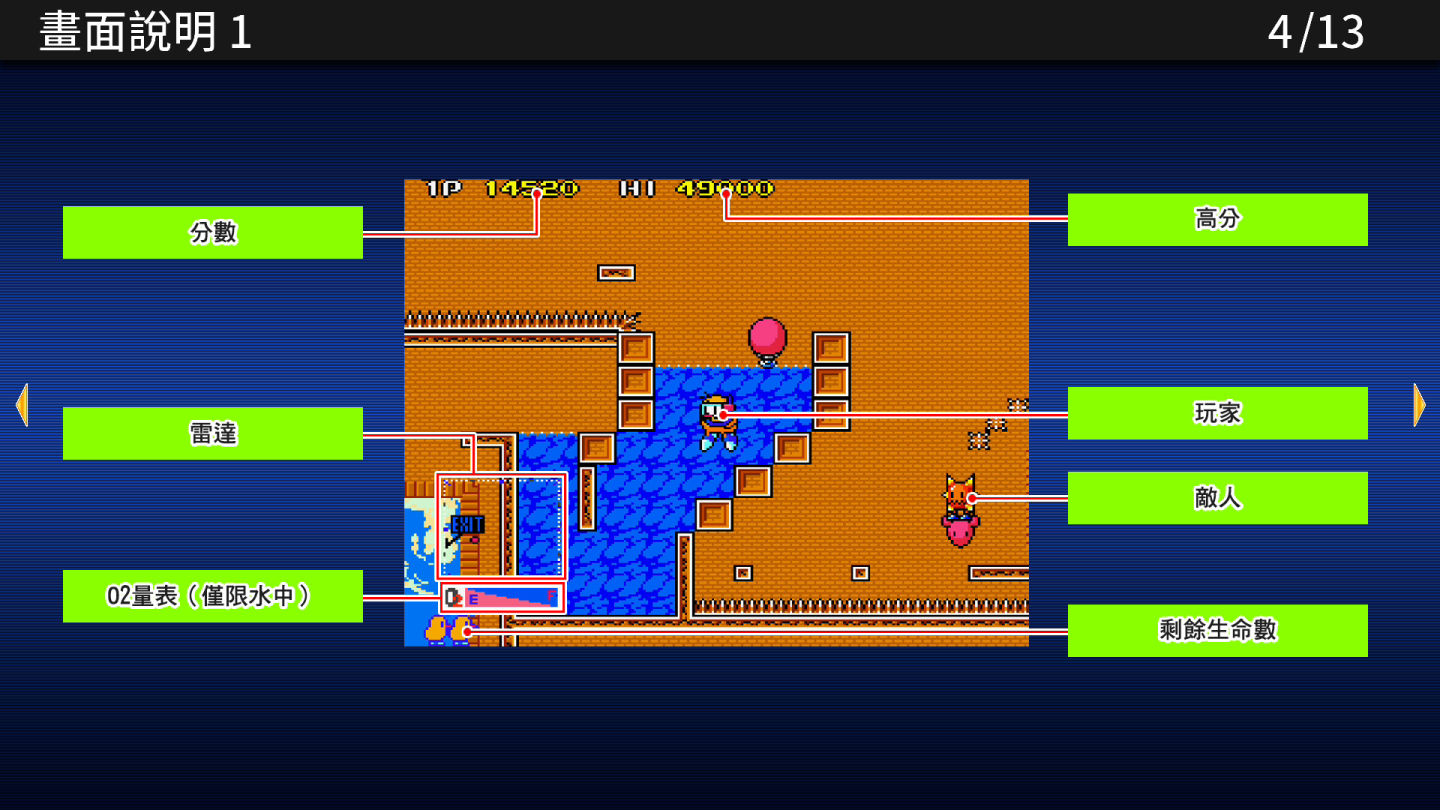 操控主角「提基」,在規定時間內到達終點的動作遊戲《THE NEWZEALAND STORY》描述為了營救被海豹綁架的皮皮和朋友的冒險故事。每個關卡由廣闊的迷宮所構成,其特點是可以利用氣球進行浮游動作。